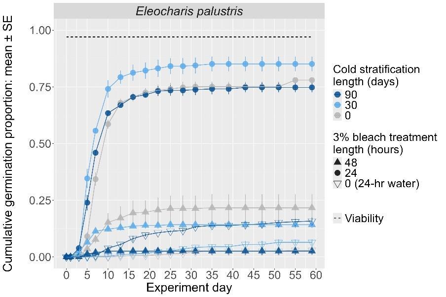 Notes: The alternative will yield slightly lower germination (5% lower) at a similar speed but could be acceptable if there is a short timeline for dormancy break. Seeds that experienced no bleach treatment had lower germination. No treatments reached above 75% germination. Further research is needed to optimize dormancy break methods.