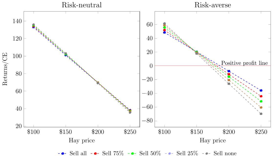 For risk-neutral ranchers, the difference in the average returns across the drought management scenarios is relatively small, especially at higher hay prices. The variability of returns (i.e., uncertainty, measured using standard deviation) increases slightly as the rancher moves from selling all unsupported cattle (Scenario 1) to purchasing additional hay only (Scenario 5) at any hay price.