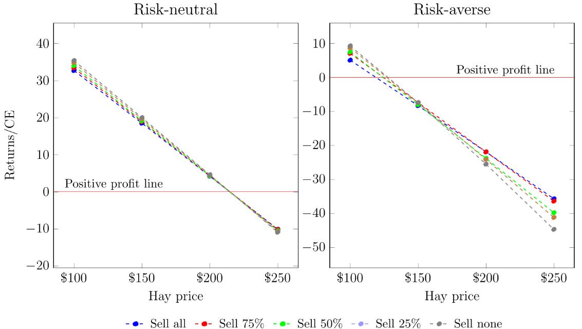 Notes Hay prices are $/ton. CE is certainty equivalent. Per Table 1, “Sell all” is Scenario 1, “Sell 75%” is Scenario 2, “Sell 50%” is Scenario 3, “Sell 25%” is Scenario 4, and “Sell none” is Scenario 5.