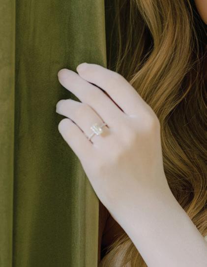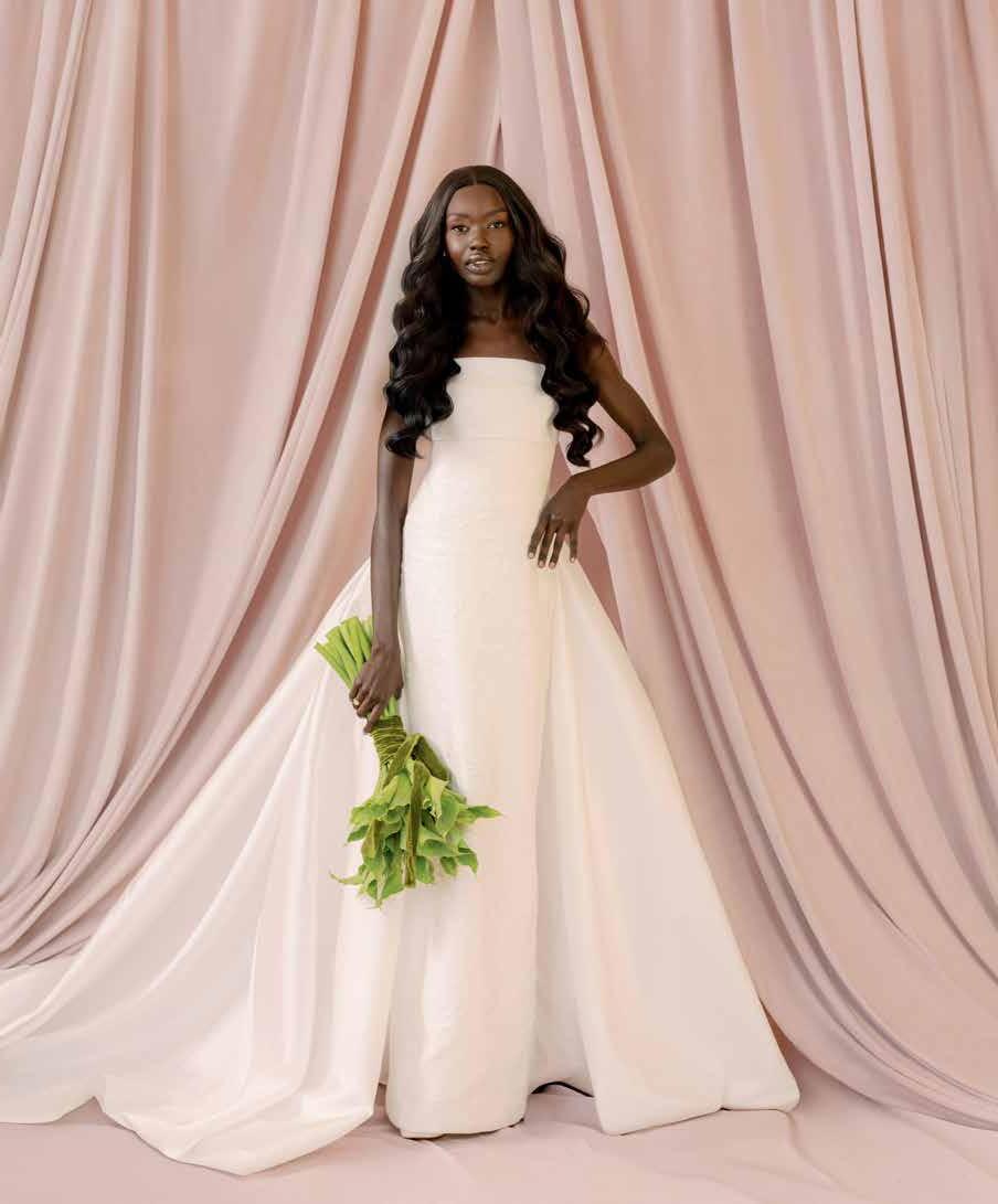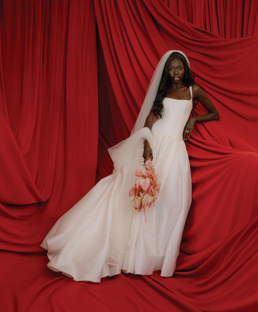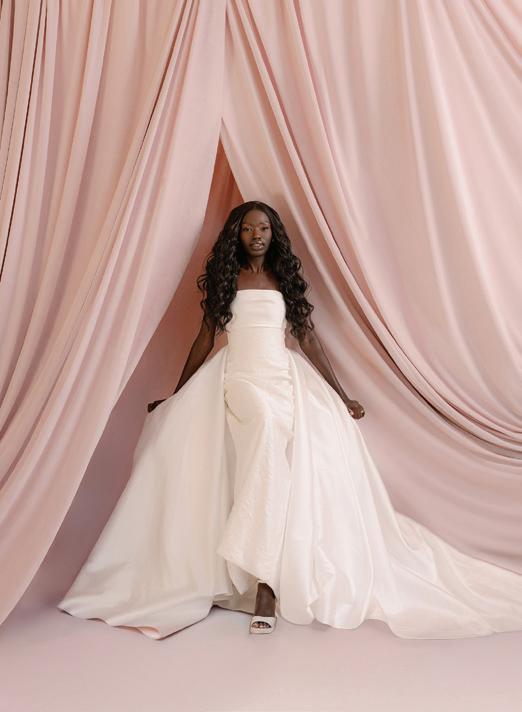 A versatile two-piece set by Moira Hughes, starting at $3,500 from Renee Atelier, ensures a truly oneof-a-kind bridal ensemble. Here, the Tempeste Bodice—featuring an elegant button closure and hand-sewn beading detail—teams with a full raw silk skirt for drama from every angle. Ole Lynggaard Pearl Jacket earrings with shooting star diamond studs in 18k gold, $13,600 set; O.C Tanner Collection 2.4k custom engagement ring in 18k yellow gold. Additional pricing available upon request.