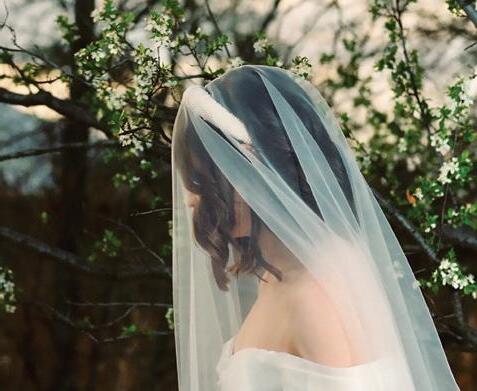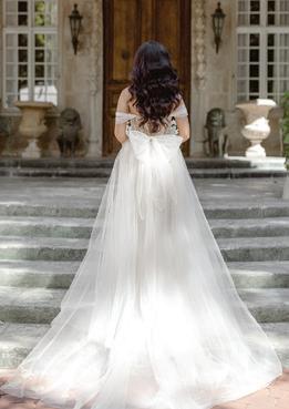 Take advantage of the spotlight with a face-framing cathedral veil—the perfect accessory to take your ensemble from basic to high-fashion. Fili gown with topper by Watters, starting at $2,395, available via