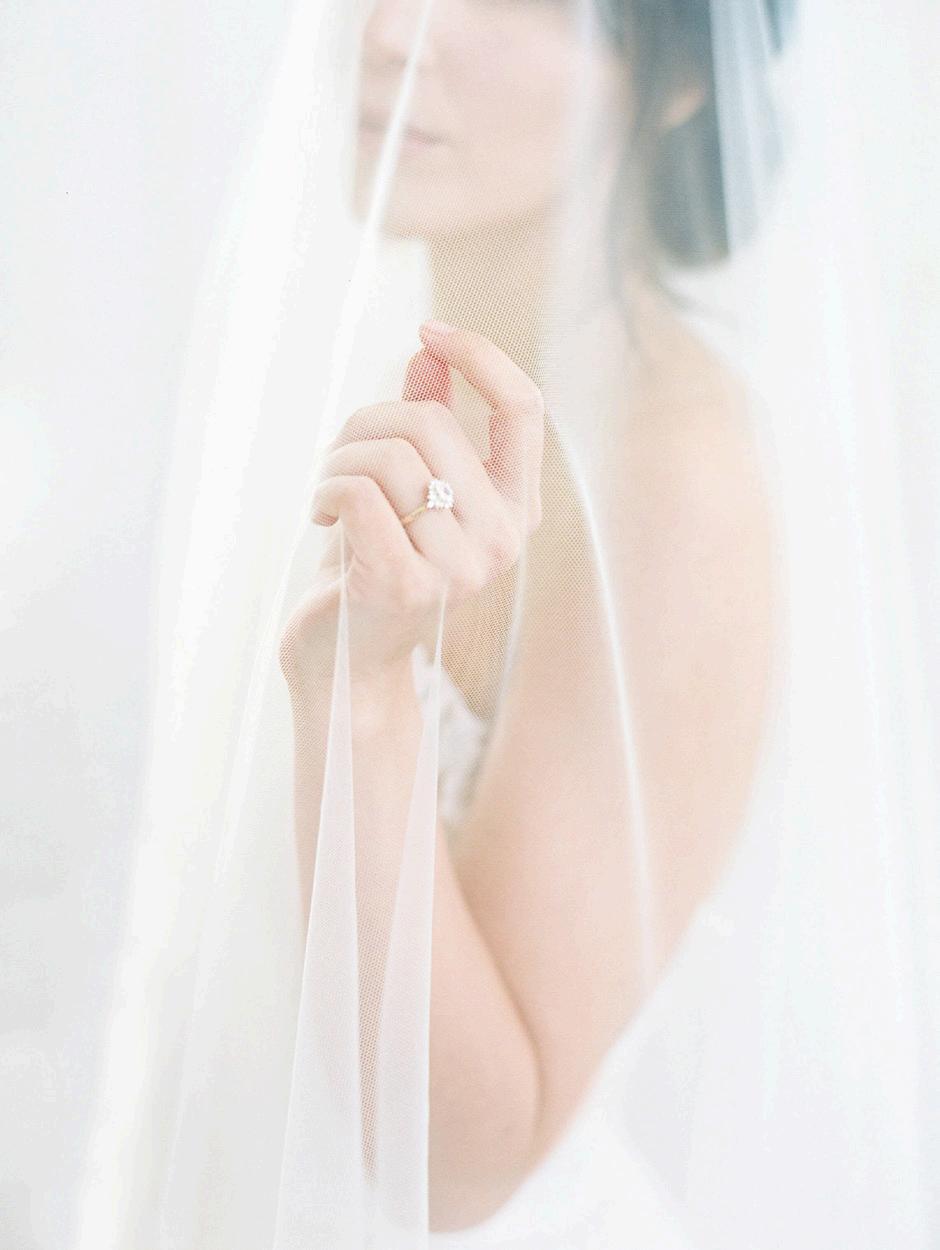 Fantasy Bridal, Murray. Mariana Hardwick cathedral veil from Renee Atelier Bridal, SLC. O.C. Tanner Collection 1.5k Round diamond engagement ring in 18k gold, $14,000.