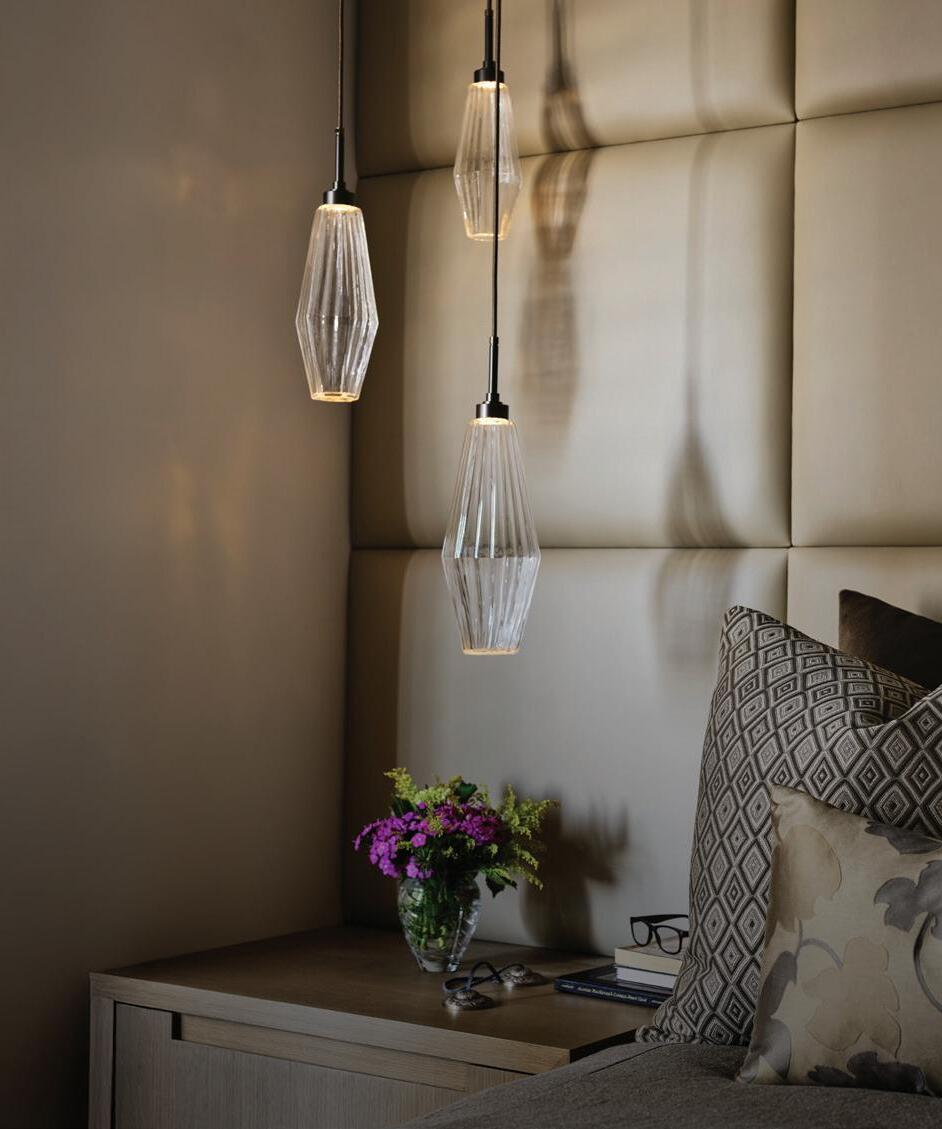 4. In a luxe Alpine master suite, a custom LED-lit arched niche—carved into a hand-plastered wall—casts a dramatic glow behind the modern upholstered bed. Home and interior by Ezra Lee Design + Build.