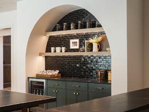 2. A bold arch encloses a high-contrast breakfast bar, surrounding dark cabinetry and a sleek, high-gloss tile backsplash. Home by RC Dent Construction; interior by CJ Design Group.