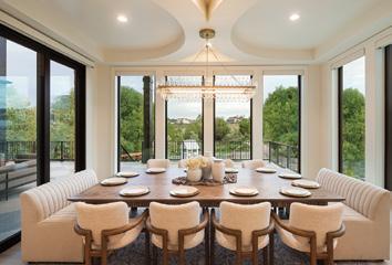 5. Custom semi-circle ceiling detail softens the hard lines and angles of a squared-off dining room in American Fork. Home by Kaizen Custom Homes; interior by Eclectic Design Co.