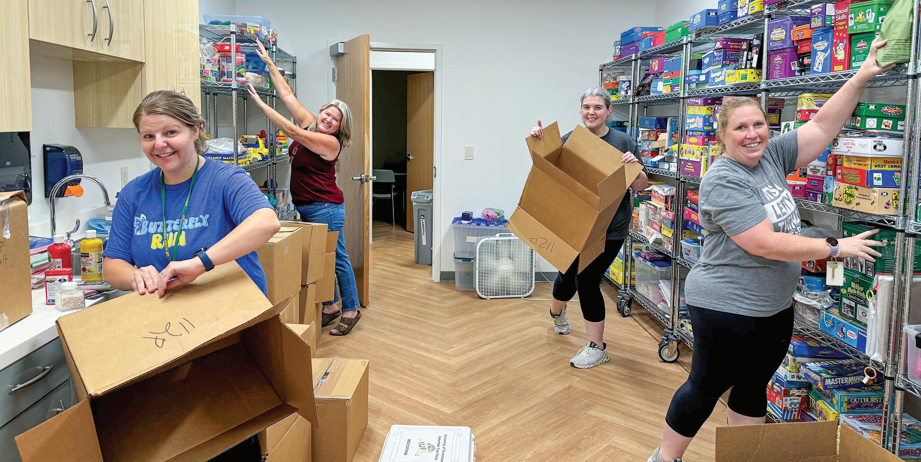 SLP clinical faculty organize materials in one of our many new storage areas. Look at those smiles!