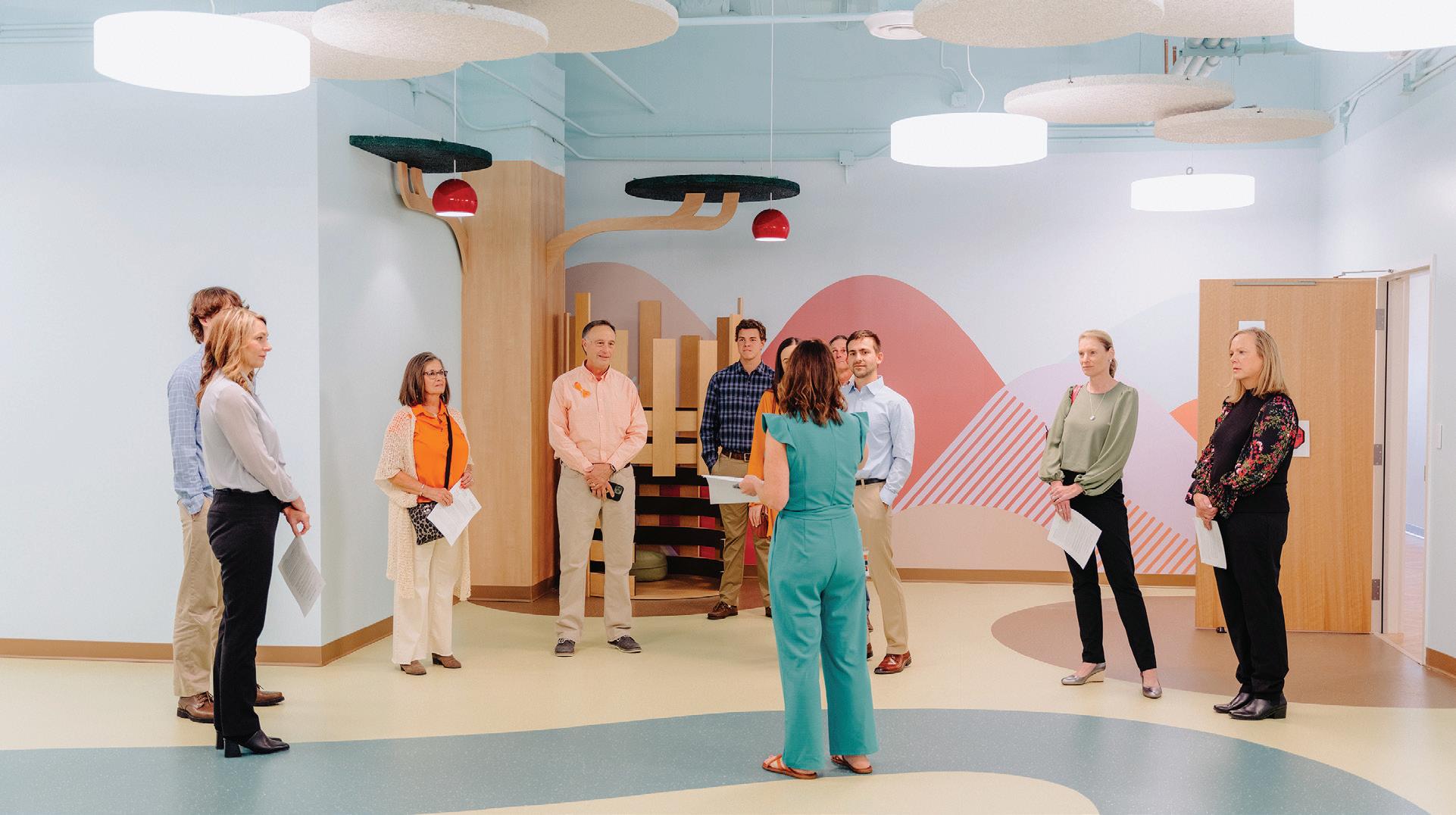 Emily Noss (in green) shows off our Tamika Catchings Inclusive Playground to guests she is taking on a guided tour of our facilities.