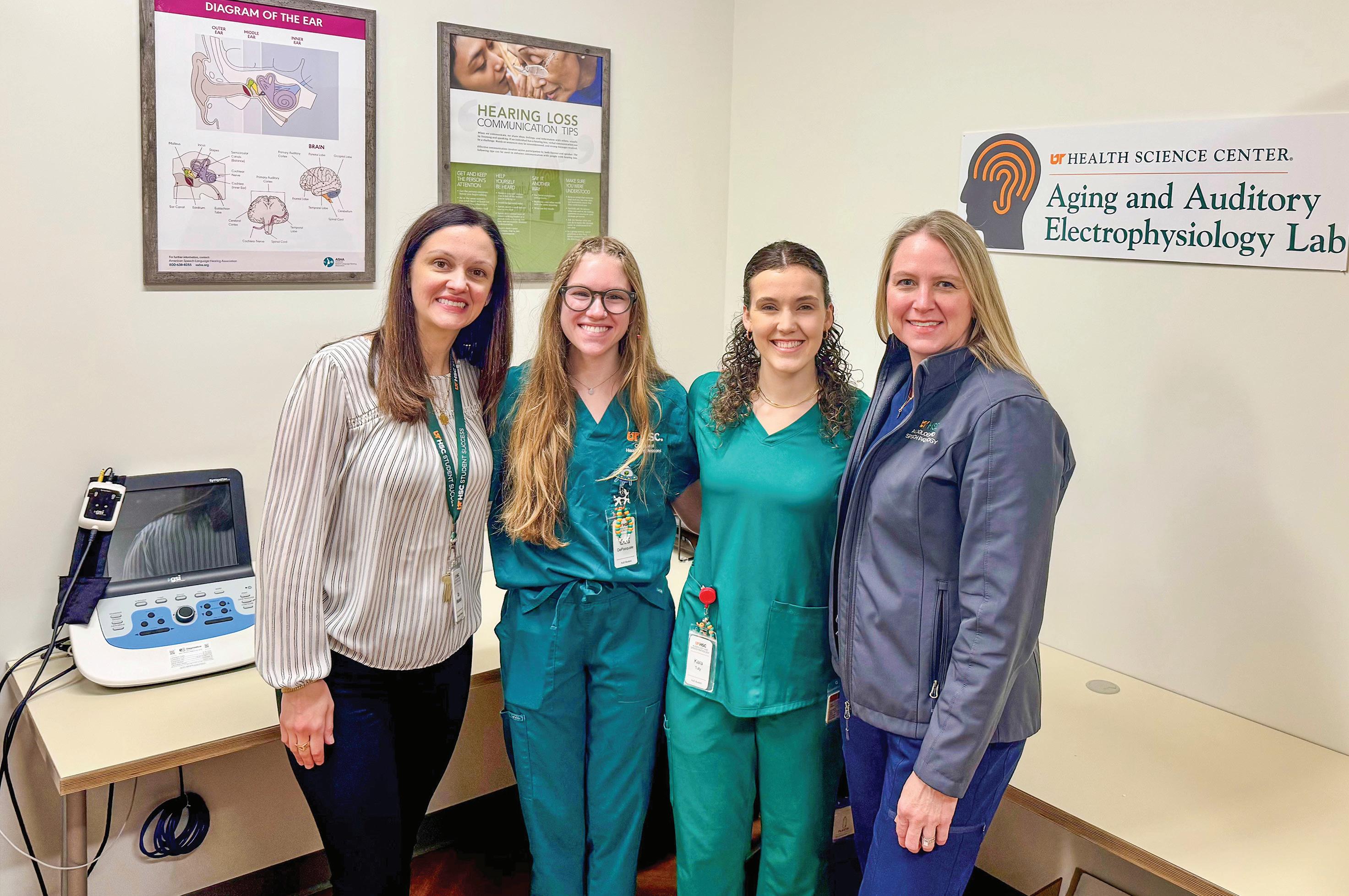 Dr. Bruna Mussoi, who joined the audiology faculty in August as associate professor, received a $100,000 Emerging Research Grant from the Hearing Health Foundation for her project, entitled "Auditory neuroplasticity following experience with cochlear implants.” Mussoi (far left) is shown below in her lab along with Dr. Beth Humphrey (far right) and a couple of AuD graduate student researchers who are gathering data for the 2-year project.