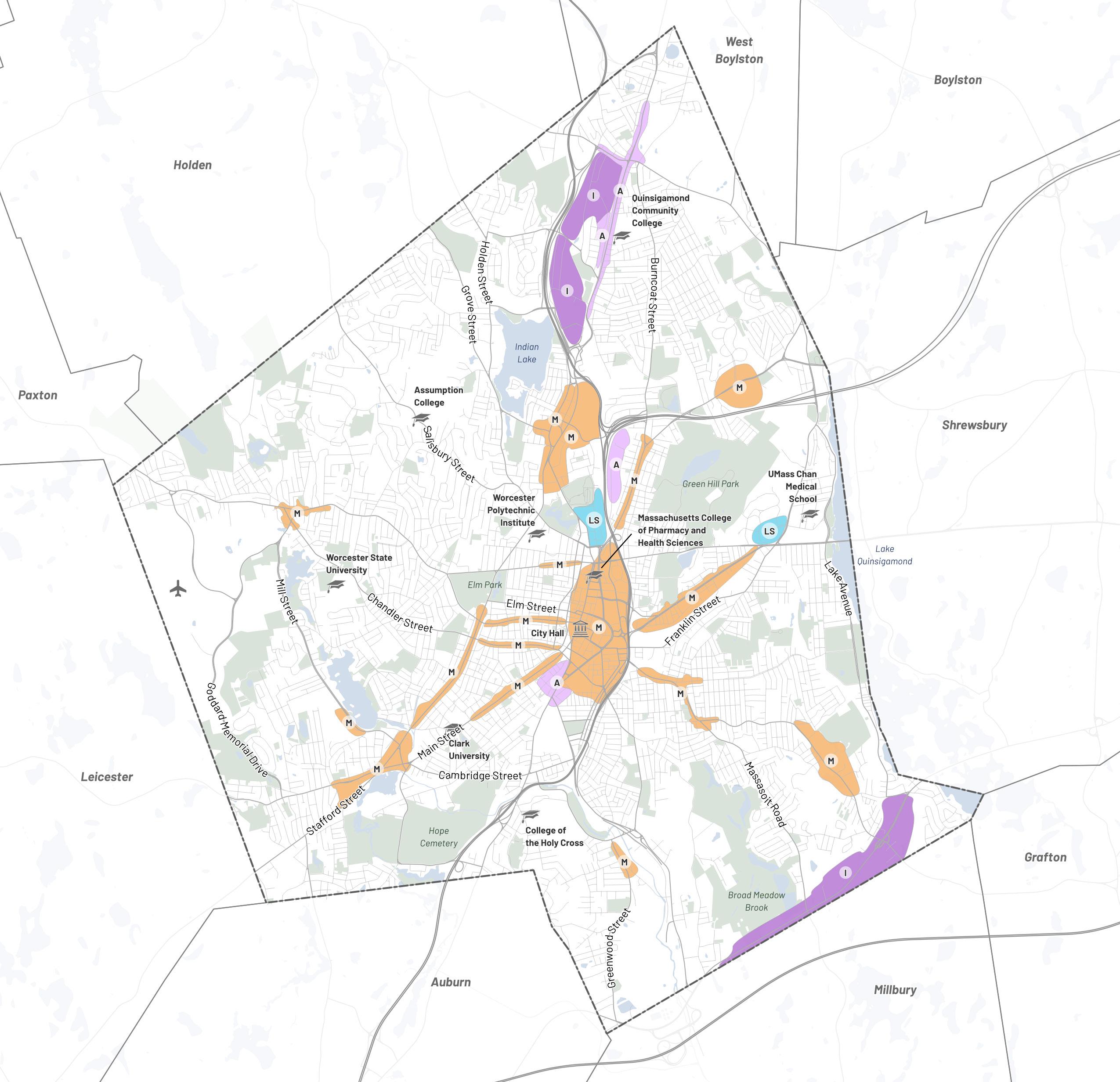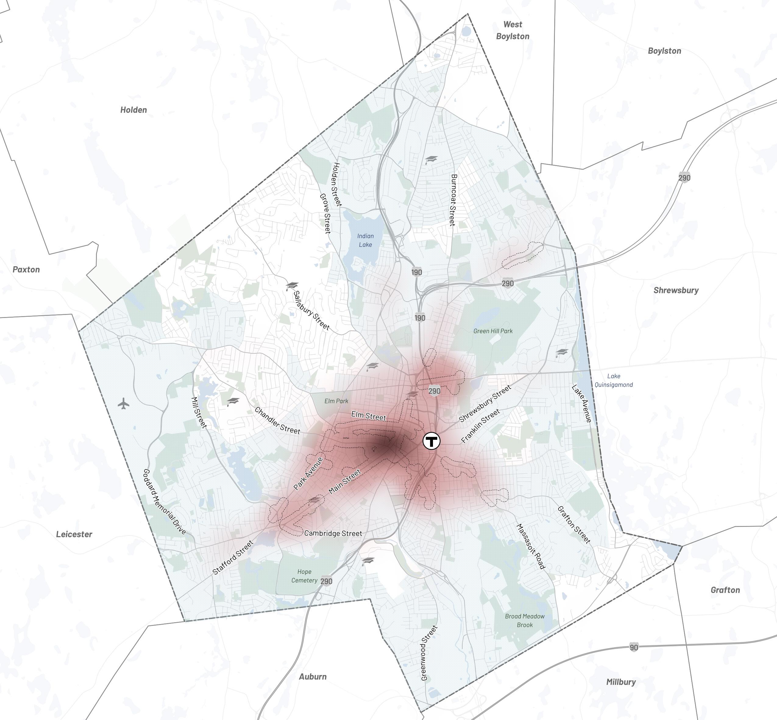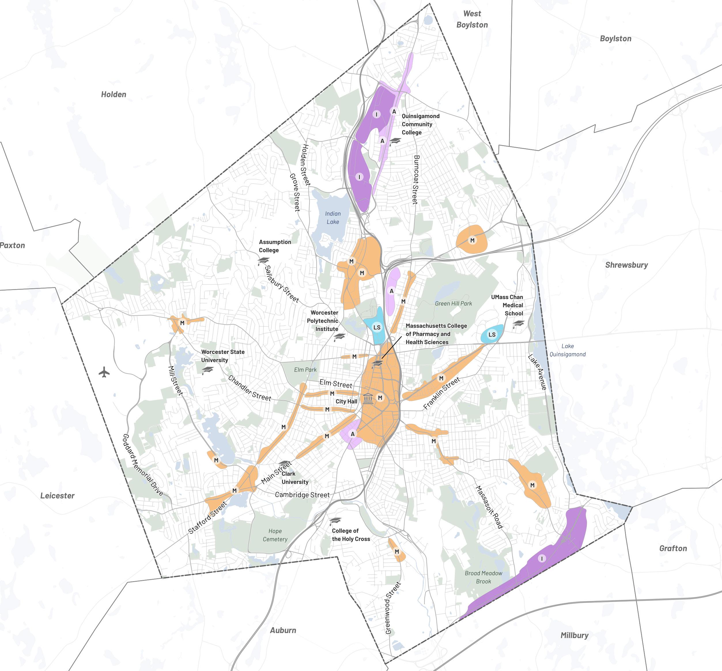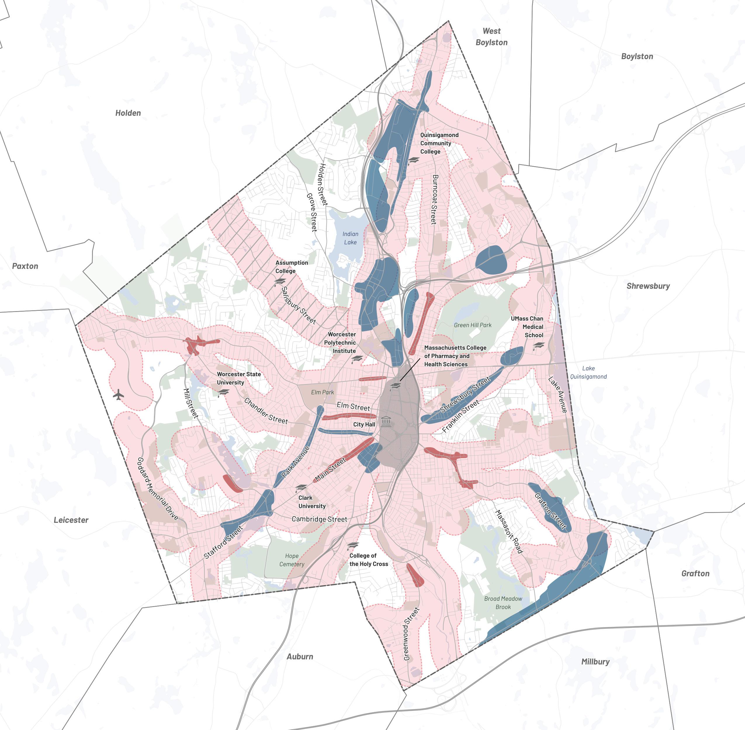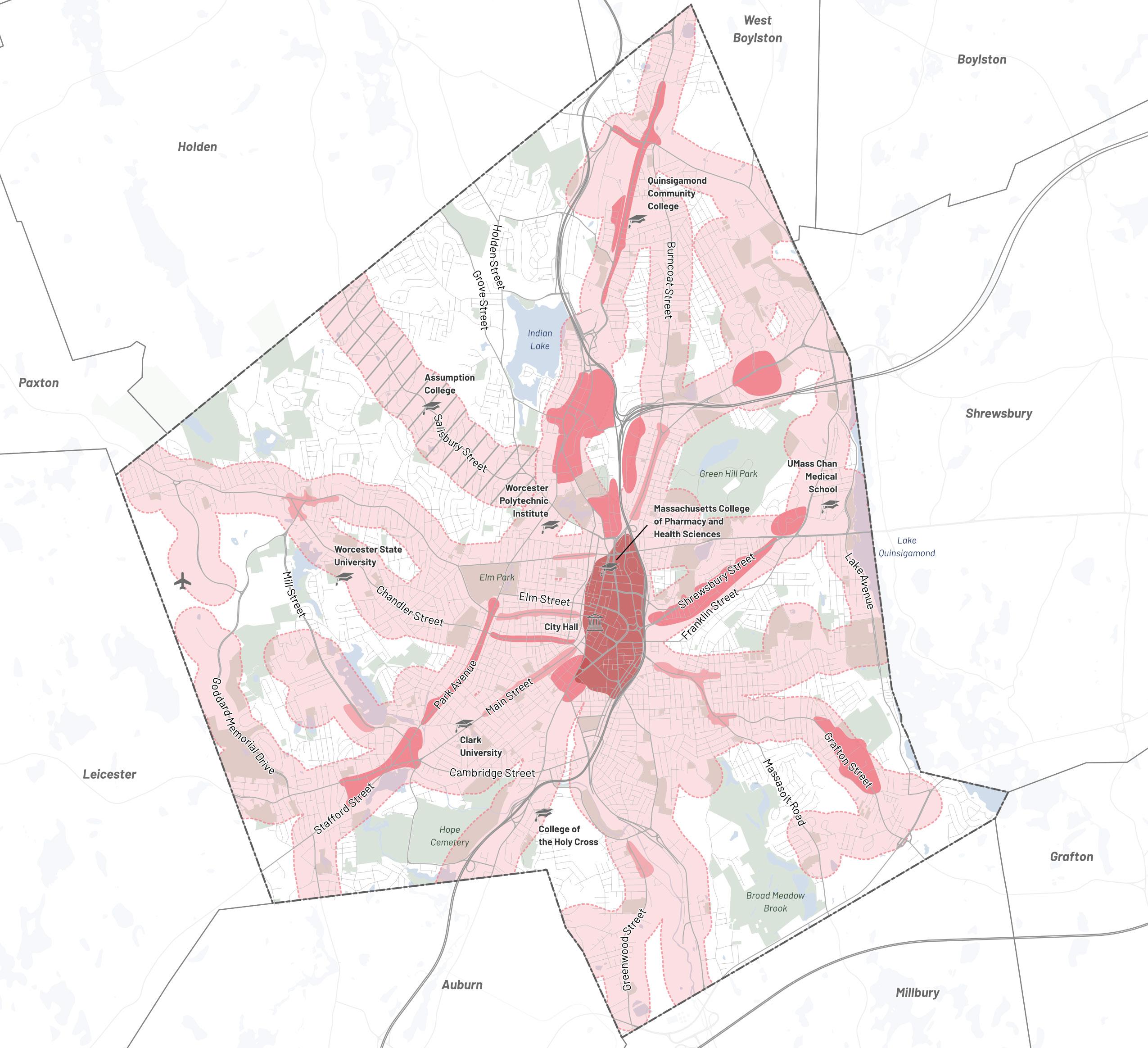 The planning team worked with the City of Worcester Advisory Committee to identify key areas to which future development would be targeted for transformation into denser mixeduse corridors and centers. Each Transformative Growth Area (TGA) and Infill Growth Area (IGA) is primed for future development due to some combination of its proximity to Downtown, connection of key urban nodes, infrastructural capacity (such as a wide roadway to accommodate denser development), or status as a local gathering place. Most of these areas likely require policy changes, in the form of revisions to underlying zoning or addition of a zoning overlay, to efficiently unlock their full development potential. Assuming development is channeled to TGAs and IGAs to maximize their potential, the five areas identified for close study–Park Avenue, Lincoln Street, Chandler Street, Shrewsbury Street, and Tatnuck Square–can absorb the majority of Worcester’s demand for residential space through 2040.