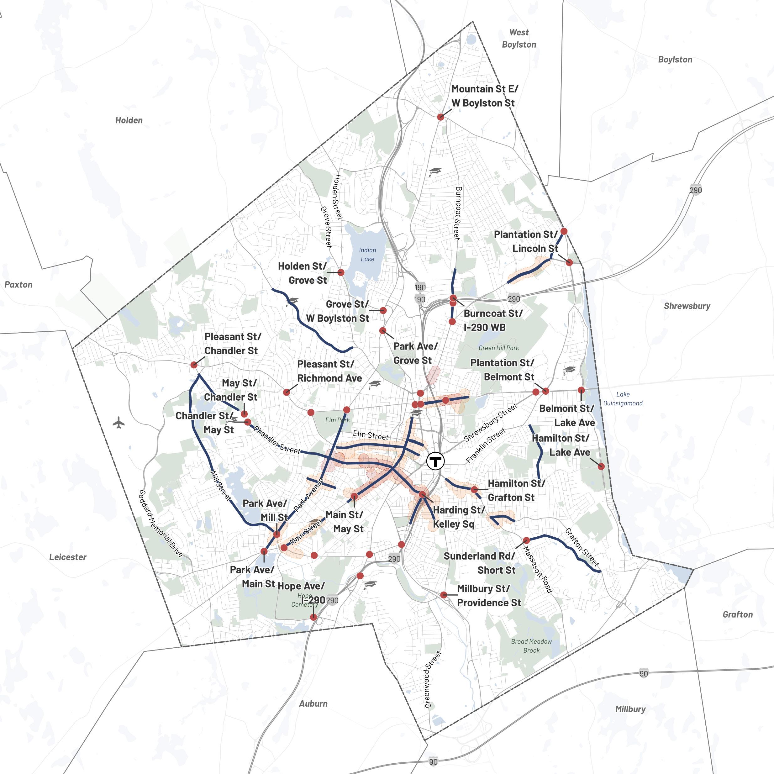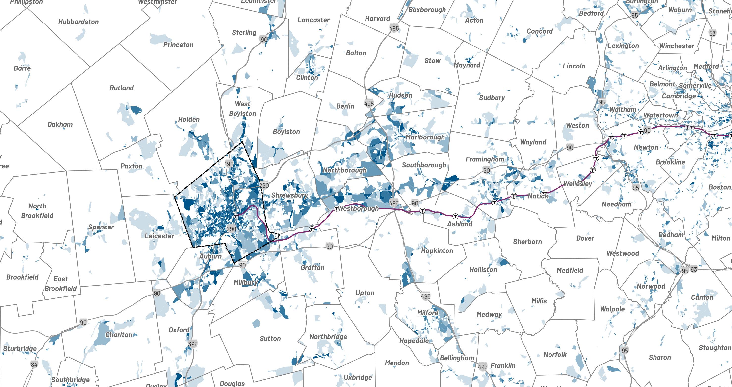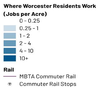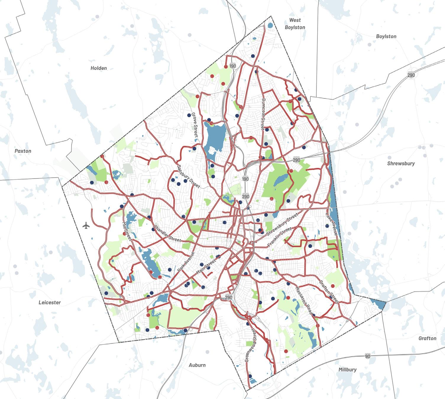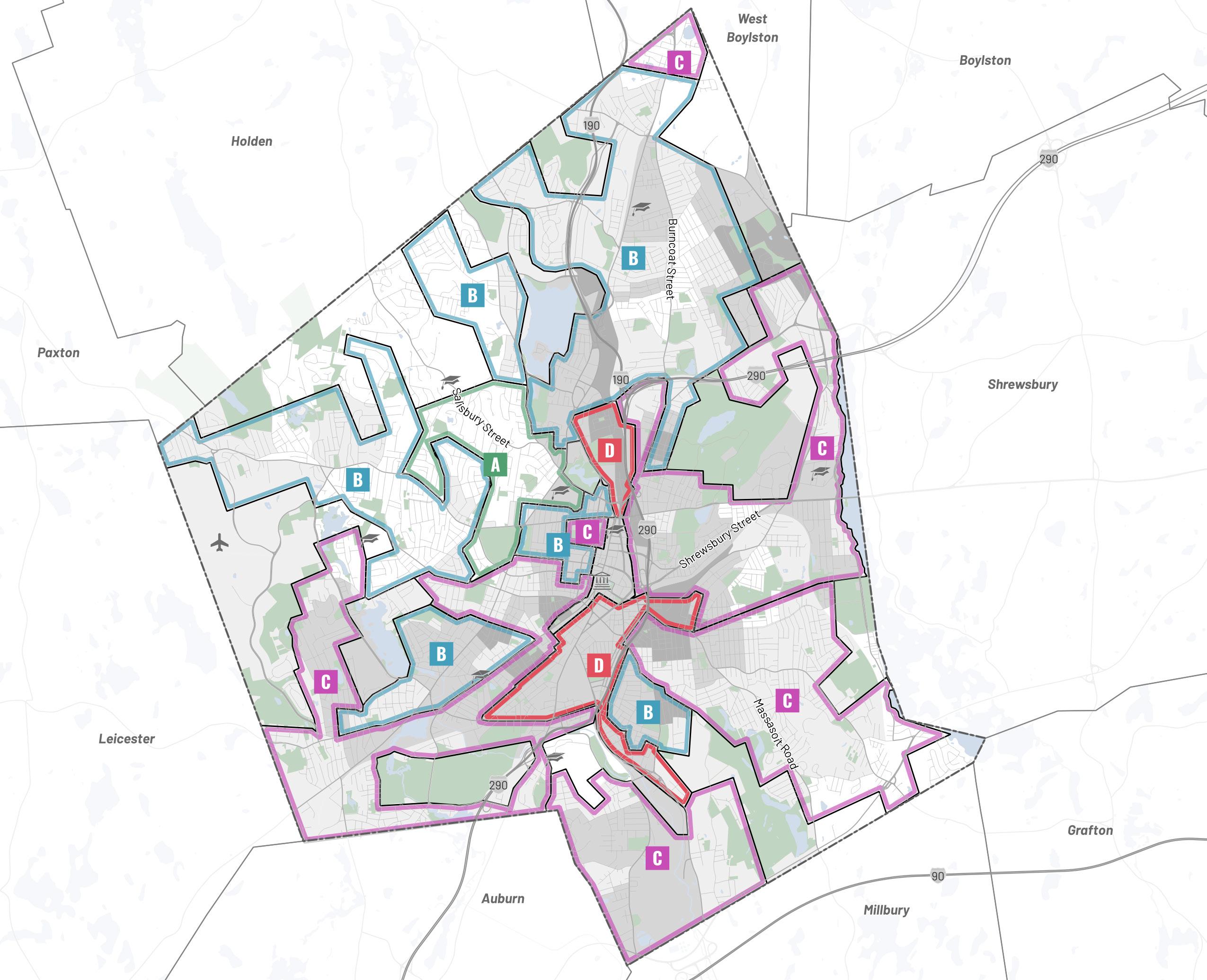 The planning team worked with the City of Worcester Advisory Committee to identify key areas to which future development would be targeted for transformation into denser mixeduse corridors and centers. Each Transformative Growth Area (TGA) and Infill Growth Area (IGA) is primed for future development due to some combination of its proximity to Downtown, connection of key urban nodes, infrastructural capacity (such as a wide roadway to accommodate denser development), or status as a local gathering place. Most of these areas likely require policy changes, in the form of revisions to underlying zoning or addition of a zoning overlay, to efficiently unlock their full development potential. Assuming development is channeled to TGAs and IGAs to maximize their potential, the five areas identified for close study–Park Avenue, Lincoln Street, Chandler Street, Shrewsbury Street, and Tatnuck Square–can absorb the majority of Worcester’s demand for residential space through 2040.