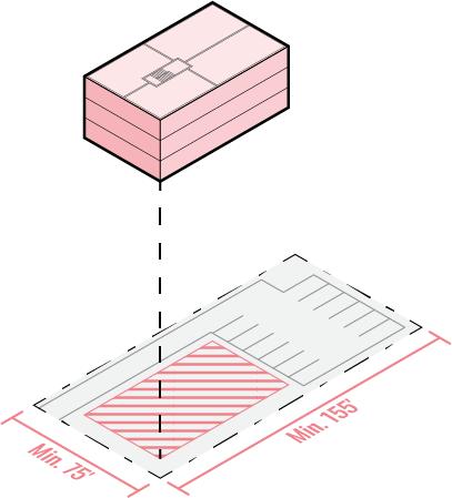 Because some soft sites were too small to accommodate a 5-over-1 building, smaller, “missing middle” multi-family building types were necessary to generate a reliable estimate of residential development capacity for each study area. Based on the area of a given soft site, and more specifically how many parking spaces could be provided, a building comprising 6 or 12 dwelling units could be deployed. These 6- and 12-unit building types emerged from test-fits on sites in the Lincoln Street TGA, where parcels tend to be smaller in general than other TGAs.