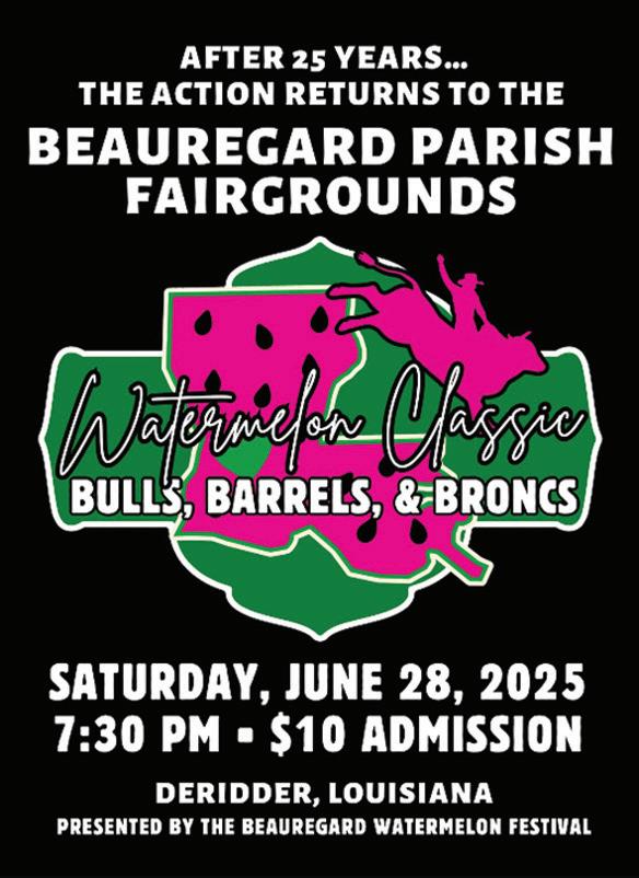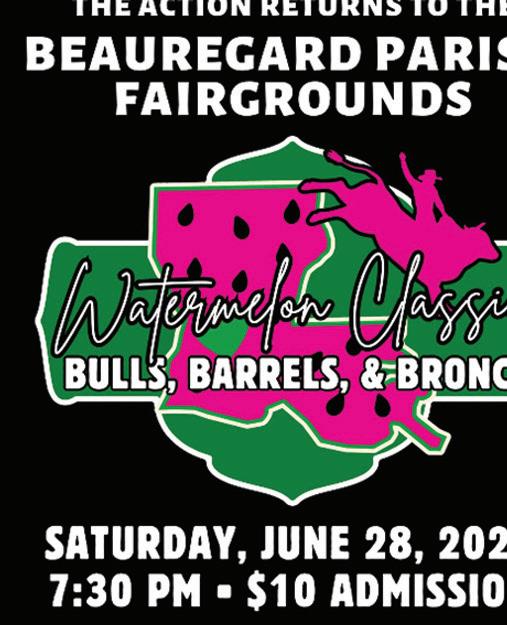 The Watermelon Classic: Bulls, Barrels and Broncs starts at 7:30 p.m. June 28. Rodeo Tickets are sold in advance and at the gate for $10. For festival details, visit beauregardwatermelonfestival.