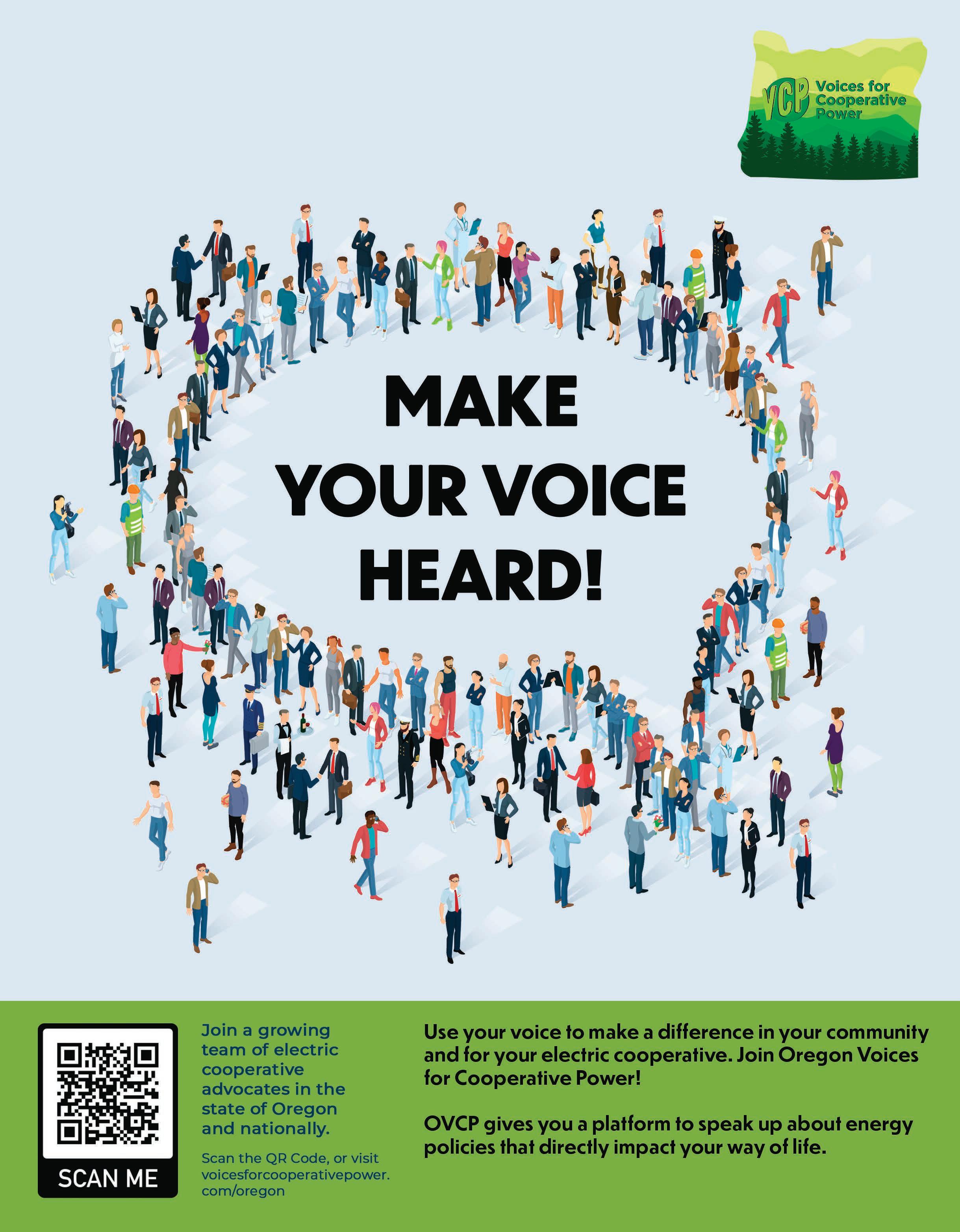 Your voice is needed, too. Oregon Voices for Cooperative Power is part of a grassroots network of more than 1.1 million advocates working to influence energy policy. This collective effort brings the voices of cooperative members directly to decision-makers locally, in Salem and in Washington, D.C. By joining VCP, you can help ensure rural communities across Oregon continue to have access to clean, safe, reliable and affordable electricity. Learn more and sign up at voicesforcooperativepower.com/oregon.