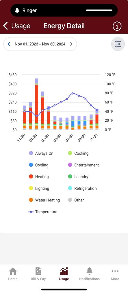 Members can also create and track a monthly budget to avoid unexpectedly high utility bills and set a point or range in time to compare differences in power use and costs.