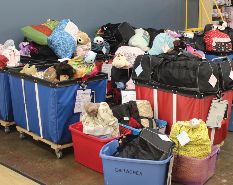 volunteers who share the tasks of sewing the bags, making quilts, sorting donated clothes and books, filling the bags and distributing them.
