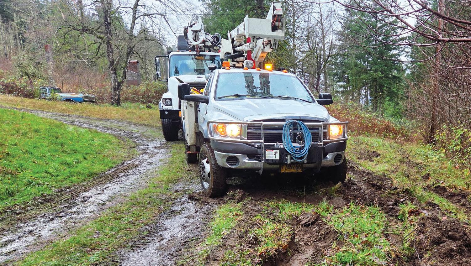 OPPOSITE PAGE: Challenging terrain and muddy roads added to the difficulty of restoring power to roughly 300 Cascade Locks customers during a December windstorm.