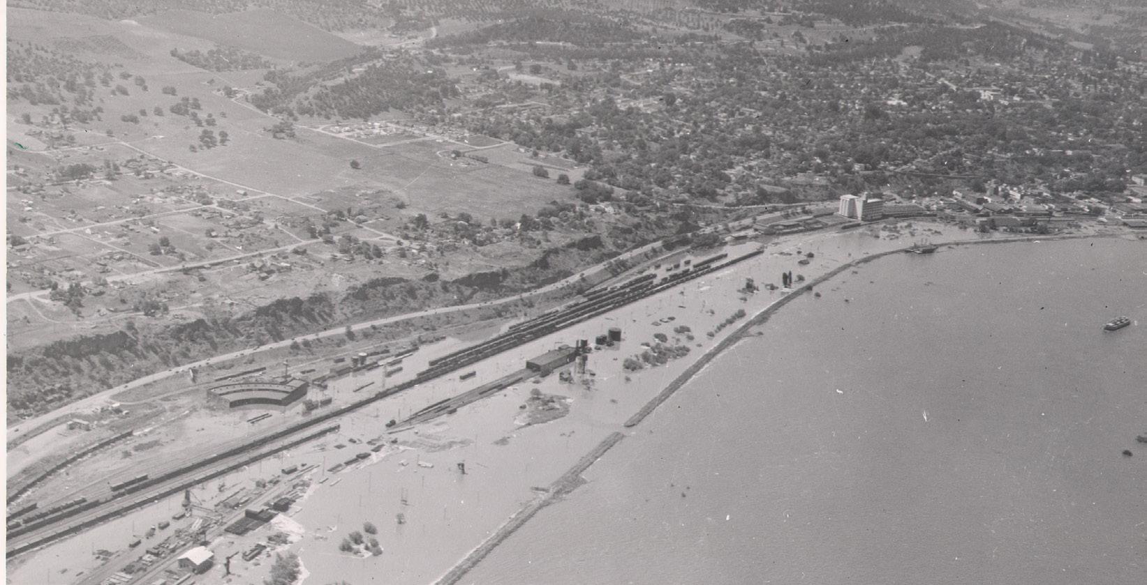FROM TOP: A canoe sits on display at Columbia Gorge Discover Center. PHOTO BY SUSAN BUCE An aerial view of The Dalles shows a flooded railroad yard and tie plant during the 1948 flood. PHOTO COURTESY OF COLUMBIA GORGE DISCOVERY CENTER, #1997.43.228.A