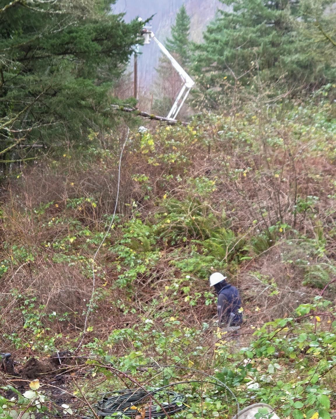 RIGHT: Northern Wasco County PUD crews spent hours hiking through challenging terrain to reach damaged power lines in Cascade Locks. PHOTOS BY CODY RICKS