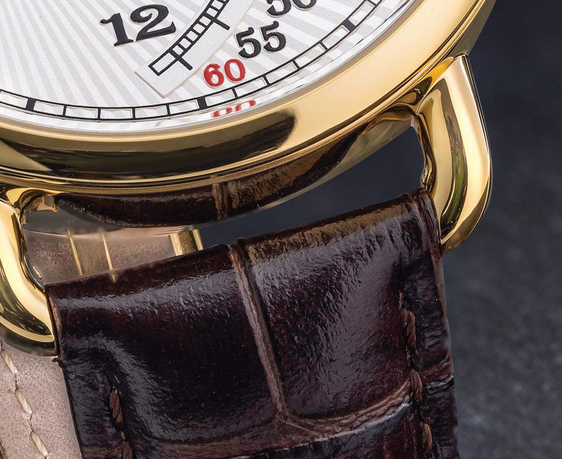 With its remarkable retrograde hour and minute indicators, sunburst guilloche face and precision movement, this design is truly one of a kind. What does retrograde mean? Instead of displaying the hands rotating on an axis like most watches, the hands sweep in a semicircle, then return to their starting point and begin all over again.