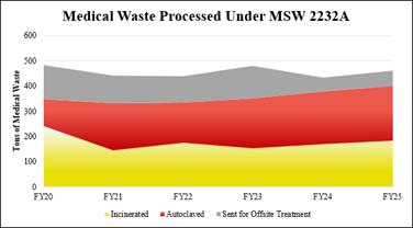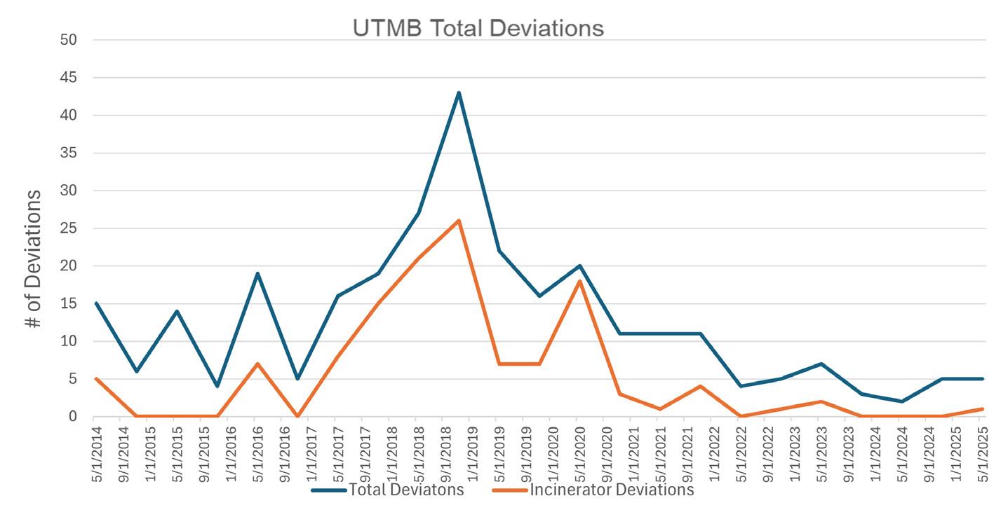 EPM is required to self-report, semi-annually, any violations or “deviations” pertaining to our air permits. The graph presents a summary of UTMB’s total reported deviations between May 2014 and May 2025. Data presented in the table reflects a significant drop in the number of reportable deviations over recent years.