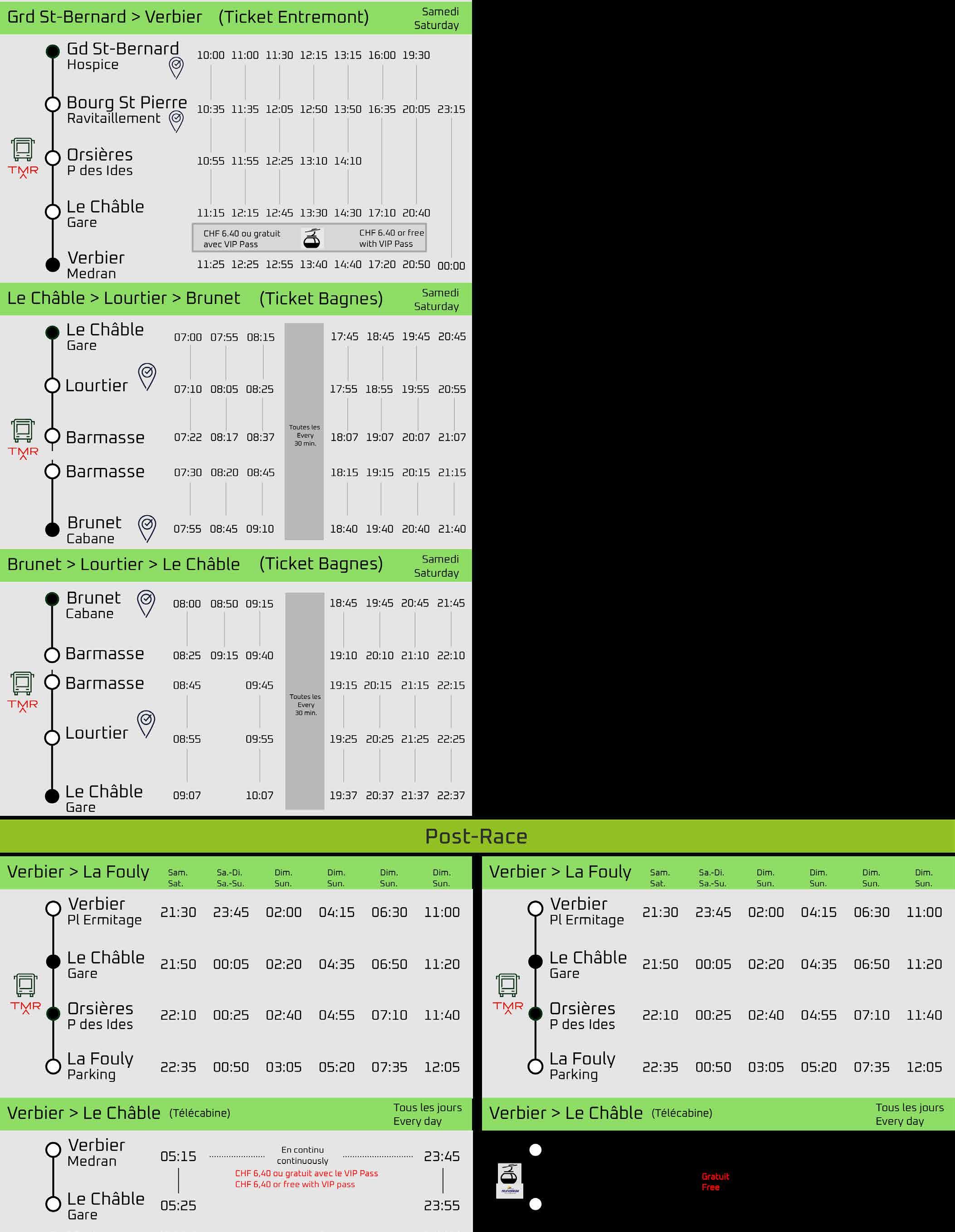 Il est ensuite obligatoire d’emprunter le télécabine Châble-Bruson pour joindre le départ. Ouvert dès 07:00. Gratuit pour les coureurs, vos accompagnants doivent acheter leur ticket sur votre t ableau de bord.