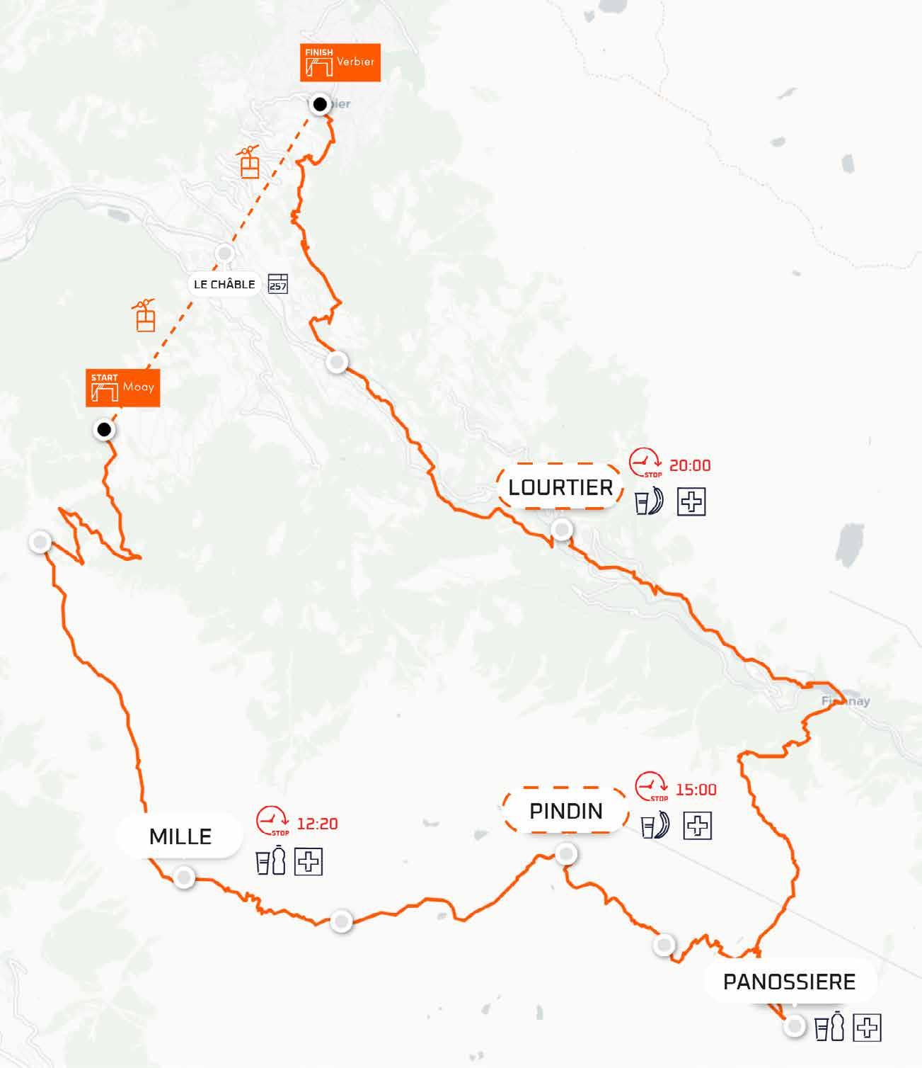 Départ à 22h de Verbier, première montée à la Pierre Avoi et descente sur Sembrancher, de là, le tracé déambule à travers quelques petits villages de montagne jusqu’à Champex puis départ pour la cabane Orny qui marque le point culminant de la course (2826m) dans une ambiance glaciaire. La course se poursuit en passant par la Fouly, les Lacs Fenêtes, le mythique col du Gd St-Bernard, le col des Chevaux et le col de Mille.