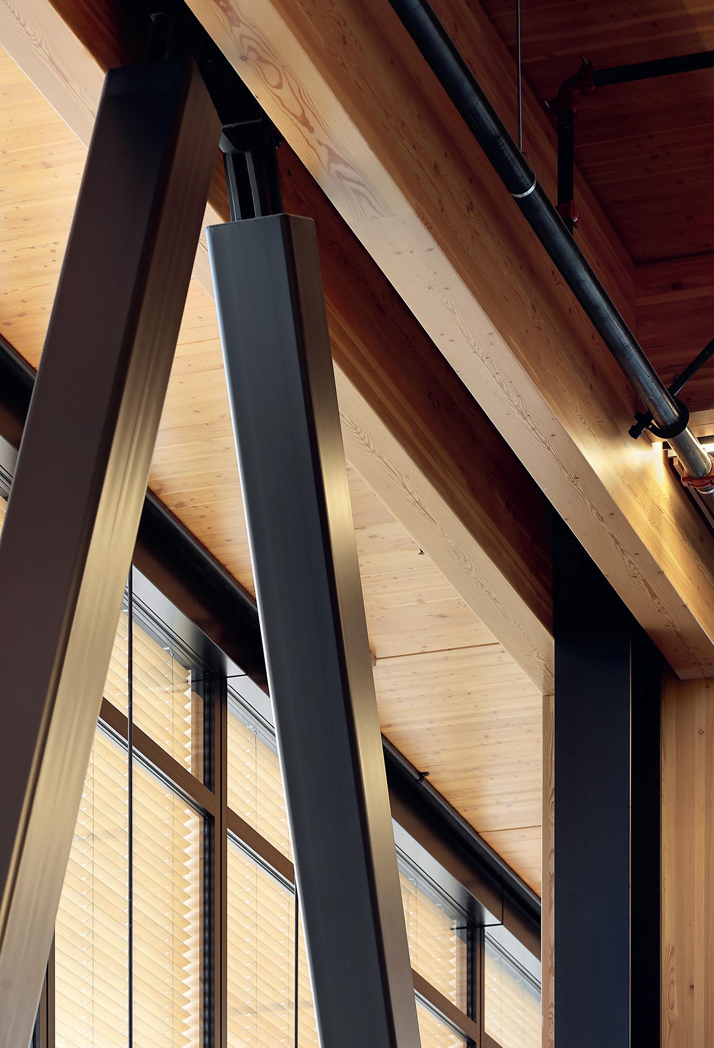 The band of windows running along the entire north face creates pleasant working light, while the pine posts dividing the window into several sections also form part of the structure.