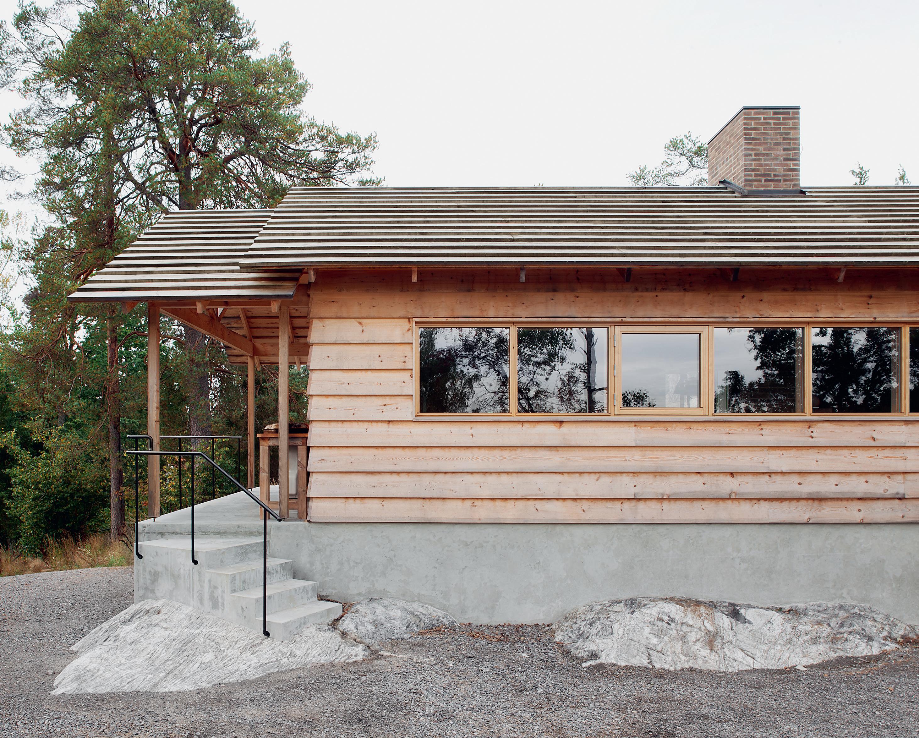 »It’s a neat little building that sits comfortably in the natural setting despite the rather uneven plot. The pronounced plinth clarifies how the building is placed on the ground, while creating the two terraces. We wanted