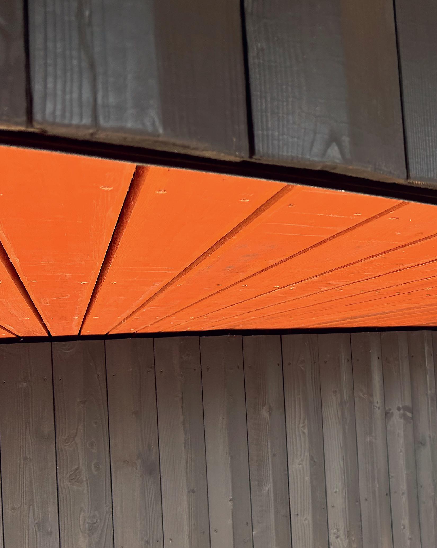 The red details come from the traditional Blekingeeka boat with its red hull. An interesting contrast against the charred wood.