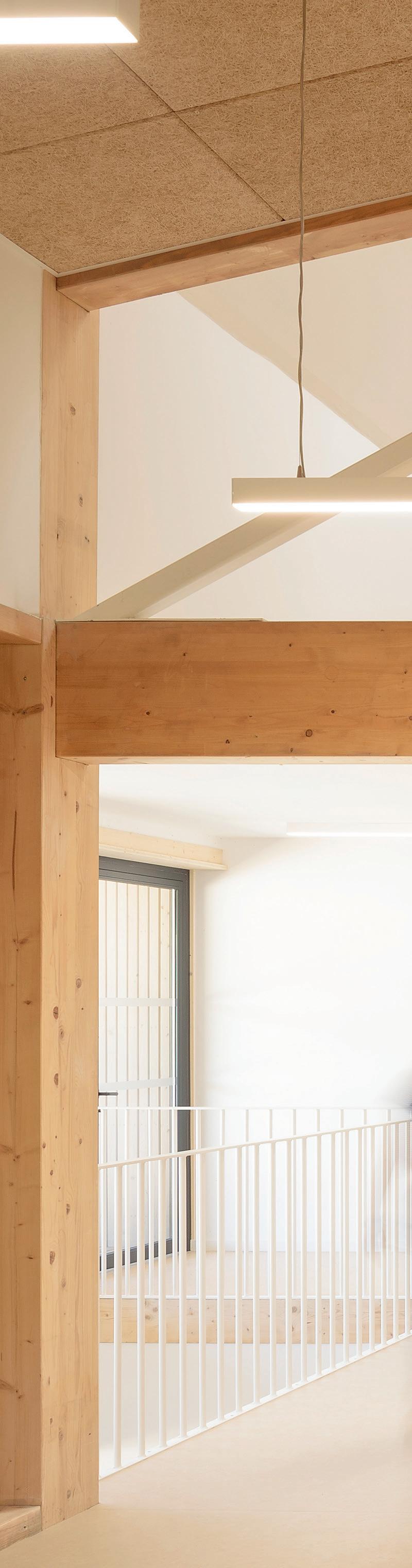 så mycket trä som möjligt och att samtidigt undersöka möjligheterna med att använda synligt KLträ i såväl golv och väggar som tak. Grundläggningen är en platta på mark, men med en KLträskiva i stället för betong. Ytter och innerväggar är av KLträ, och ytorna är lutade, uVbehandlade eller målade med linoljelasyr i olika kulör. Restbitar från fönster och dörröppningar har använts till trappor och fönsterbänkar. Fasaderna är klädda med locklistpanel av ramsågad douglasgran. Vindskivor och andra utsatta delar är av europeisk lärk.« w| wingardhs.se