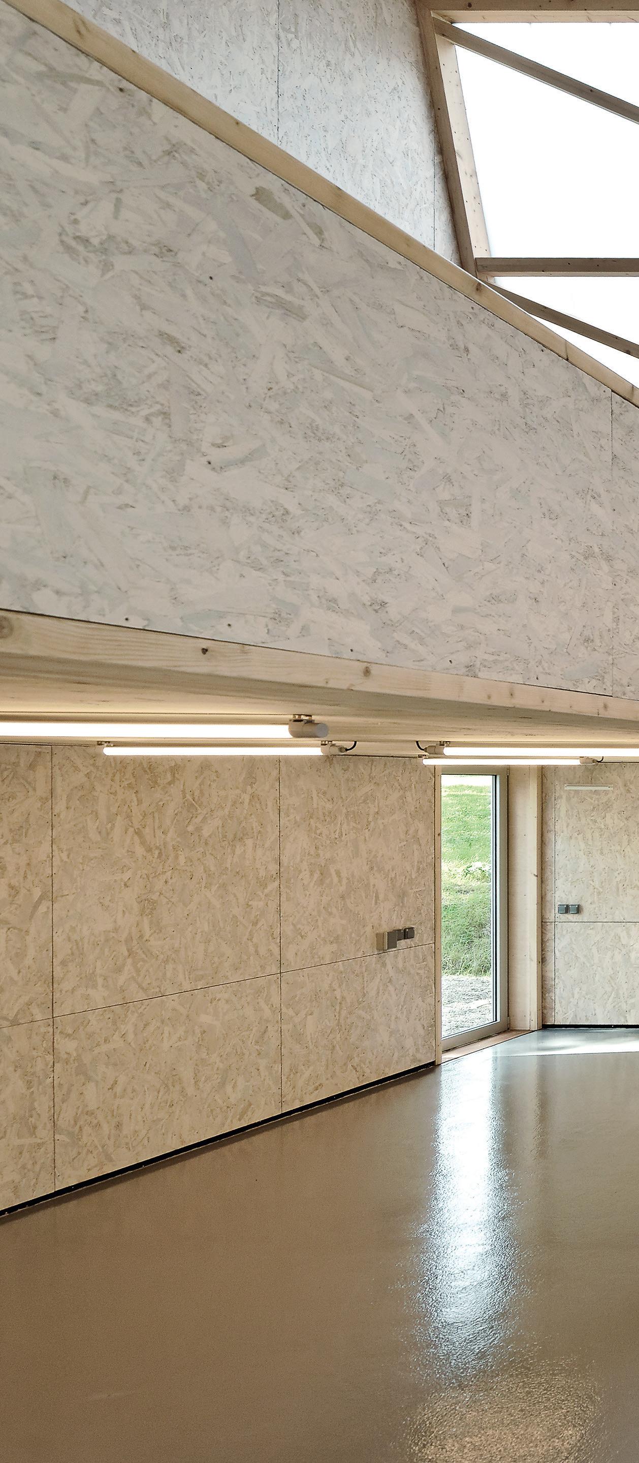 wherever we can. We left the structure exposed in the roof instead of closing it in for both aesthetic and climate reasons. It uses less material and keeps the price down. We have no extra layers above or below the floor either, no sound insulation, you’re walking directly on the structure,« says Katja Knaus.