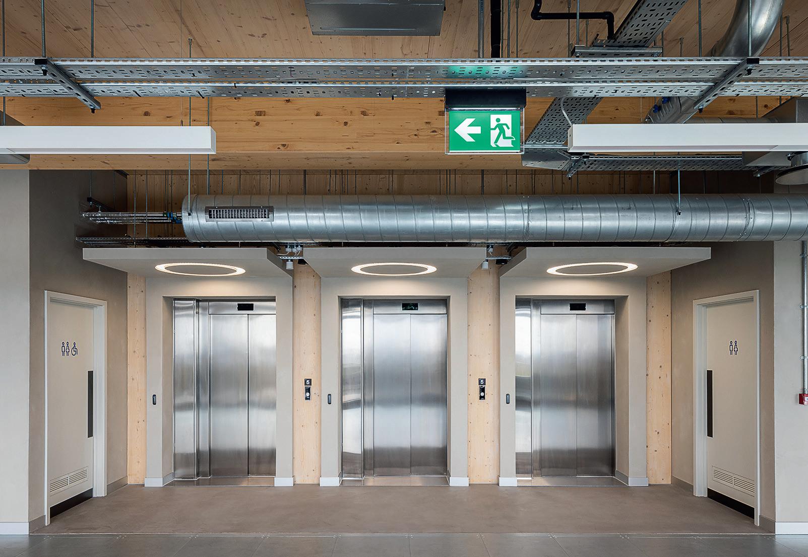 Apart from the concrete foundations, the whole building is wood. The lower floor is a timber-framed structure on top of which rests a CLT floor system. Above that, the topology is reflected in the exterior, with its exposed glulam posts and spruce CLT panels. The internal walls are also made of CLT. Glulam roof beams rest on the posts, supporting a ceiling made of three-ply edge-glued panels. The building is insulated externally and boarded out in timber cladding. As much as possible is made of wood primarily for climate reasons.