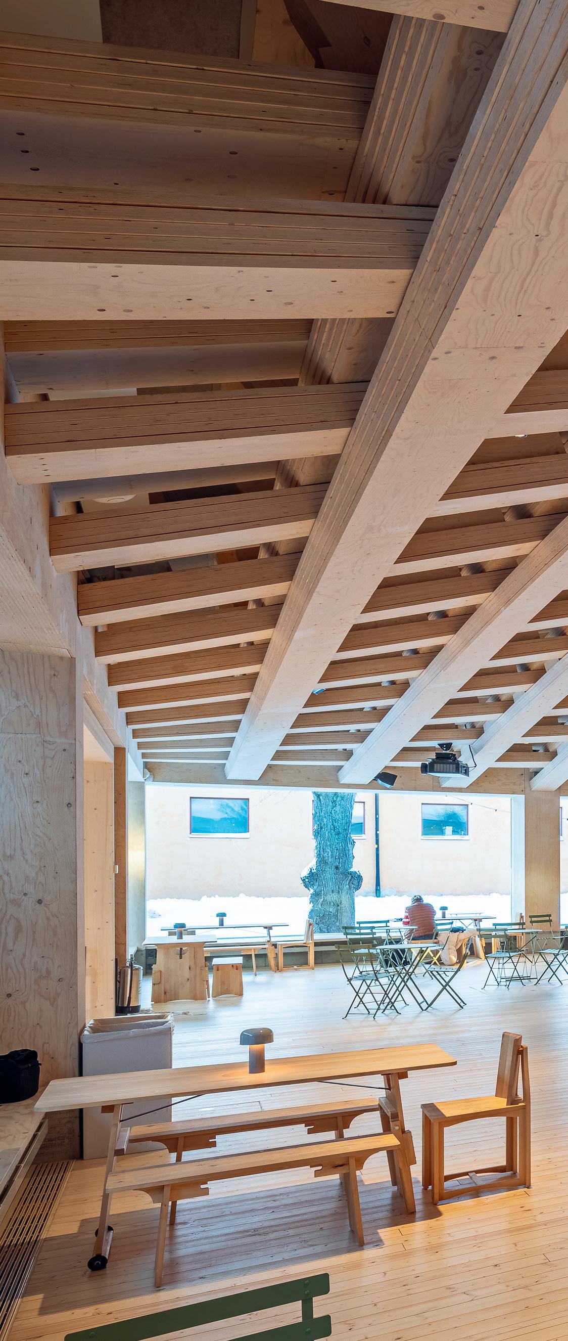 kibichuo, japan I prefekturen Okayama finns Japans största tillverkare och leverantör av korslimmat trä, KL-trä, och vad passar då bättre än att med hjälp av en byggnad visa hur man kan använda materialet? I ett gemensamt projekt mellan lokala företag och universitetet har man skapat en kreativ coworkinganläggning som också innehåller kafé. Bygganden är placerad i en slänt med en höjdskillnad på fyra meter. KL-träpanelerna, som är 2,2 meter breda och 35 meter långa, har här staplats på varandra i olika vinklar. Vinkelförskjutningen gör att panelerna skapar en mängd olika utrymmen och öppningar mellan sig. Den exponerade takstrukturen är en viktig visuell del av interiören, och här syns även ventilationsrör och stålförband, en intressant kontrast till det varma träet.