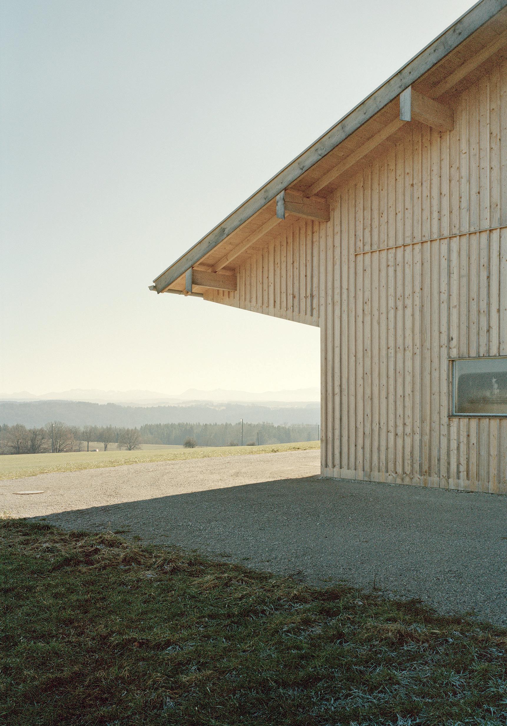 En lantbrukare i Sydtyskland behövde en ny maskinhall. Det blev en lågmäld byggnad som vackert smälter in i landskapet, byggd av virke från egen skog. Den varma atmosfären har lett till att hallen även används som festlokal.