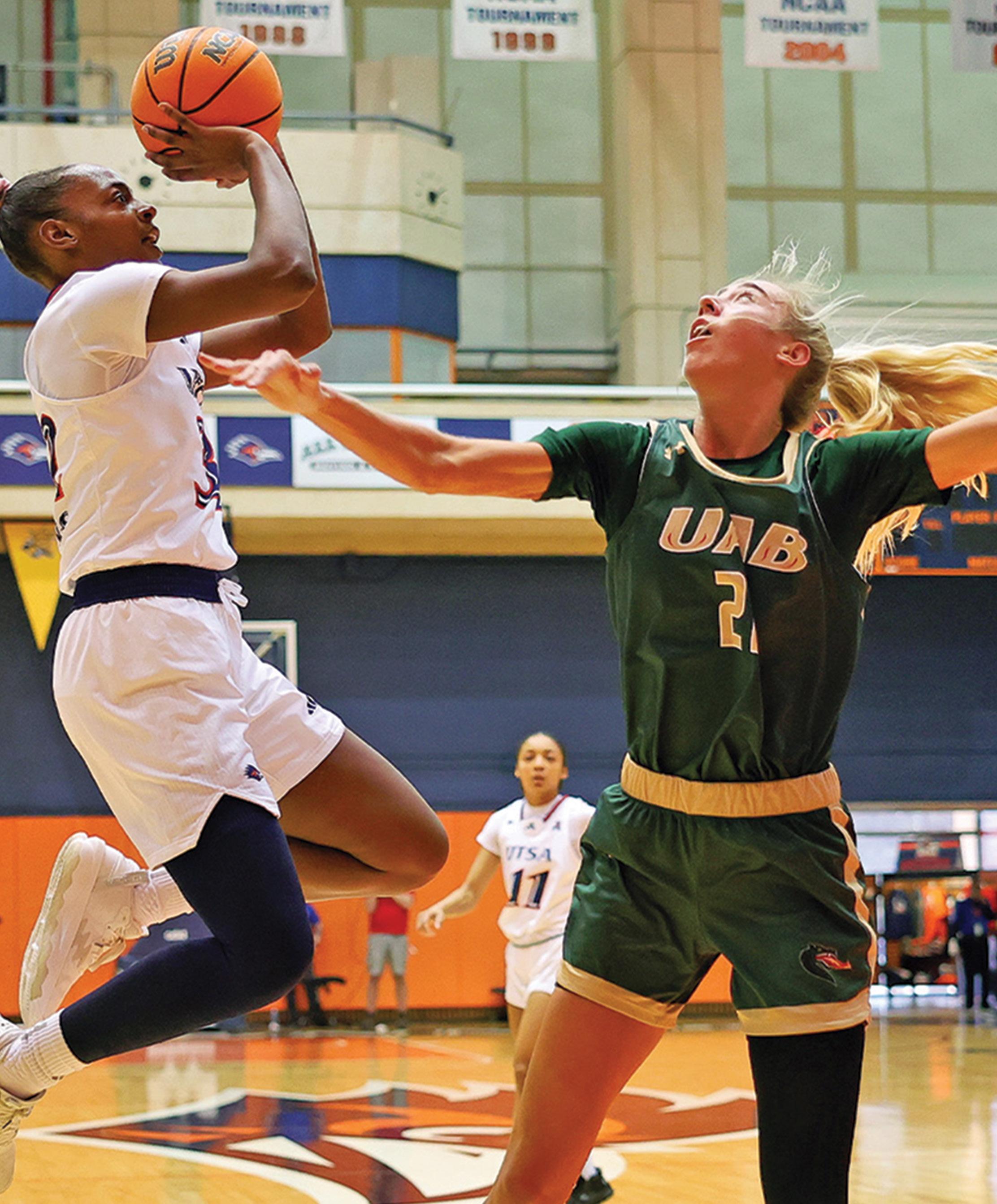 UTSA forward Jordyn Jenkins hangs in the air for a jump shot over UAB defender Maddie Walsh in the Roadrunners’ 76-58 victory on February 11. The UTSA women’s basketball team finished in fourth place in the American Athletic Conference last season and earned a postseason invitation for the first time in 15 years, participating in the Women’s National Invitation Tournament. Led by accomplished head coach Karen Aston, and with star players like Jenkins, Elyssa Coleman, Aysia Proctor and Sidney Love all returning, the Roadrunners will be among the favorites to win the conference championship for the 2024-25 season.