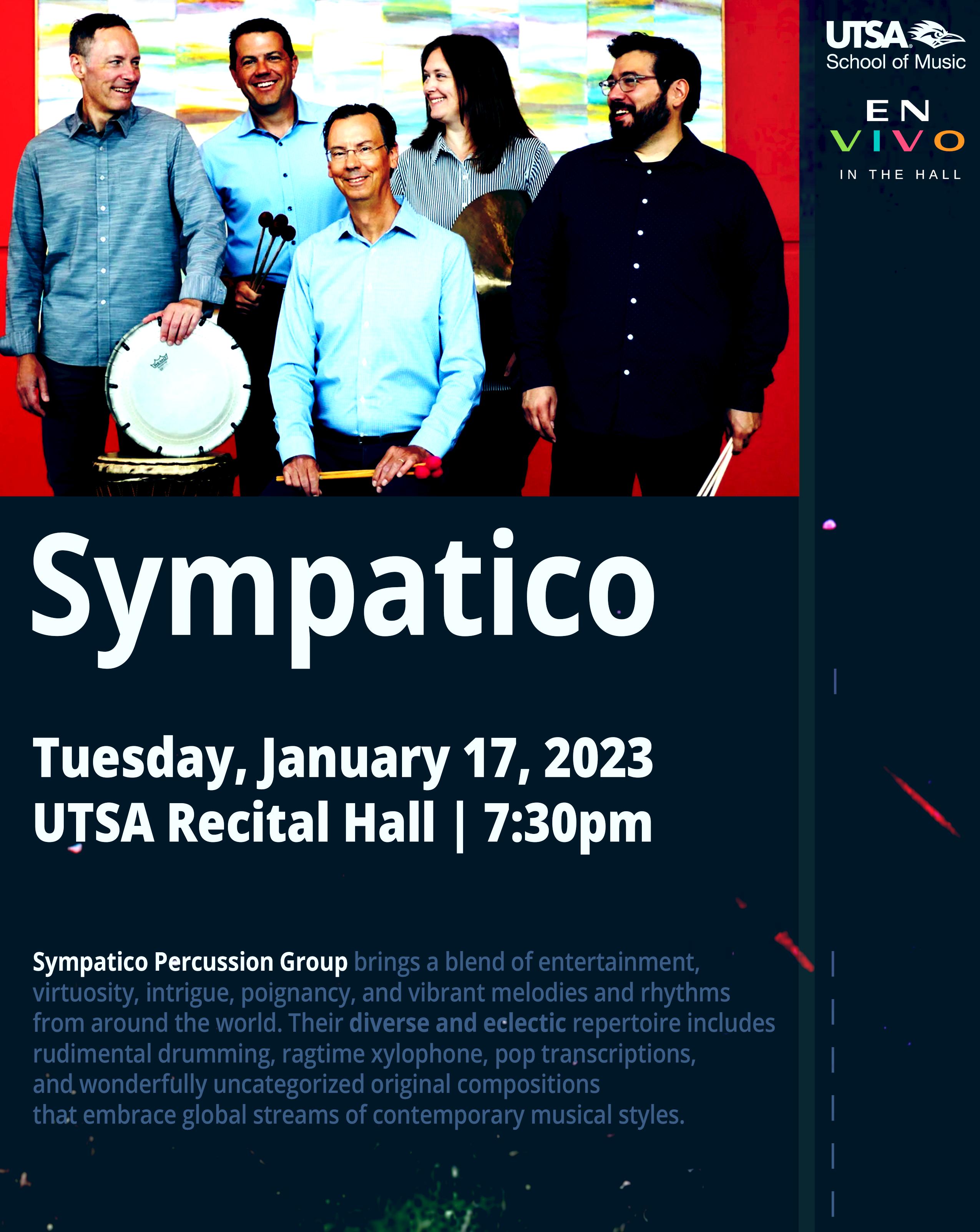 Sympatico Percussion Group, the first artist to perform at UTSA in 2023, is a percussion quintet that has been putting together vibrant and entertaining performances throughout North America and abroad since 2008. The group is comprised of seasoned percussionists Scott Herring, Joseph Krygier, Johnny Mendoza, Christopher Norton, and Susan Powell, who collectively bring decades of experience and knowledge as performers and educators.