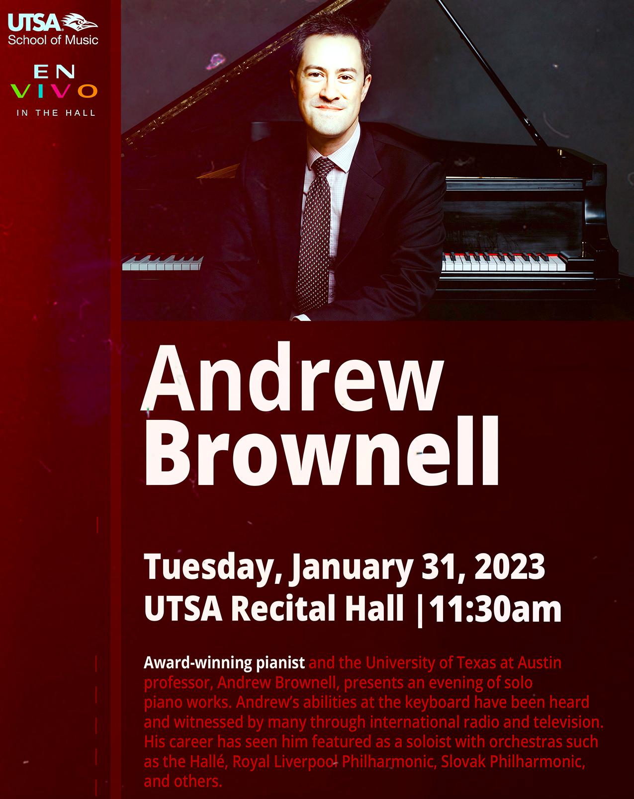 The UTSA School of Music is in full swing for 2023 with its new concert series, En Vivo - In the Hall. The series brings world-class, internationally acclaimed musicians to San Antonio for performances that are free for the community to attend. The series made its debut in November with guest pianist Tammy Miller from the Omaha Conservatory of Music, picks up with 11 dates lined up for the Spring semester–three of those scheduled in January.