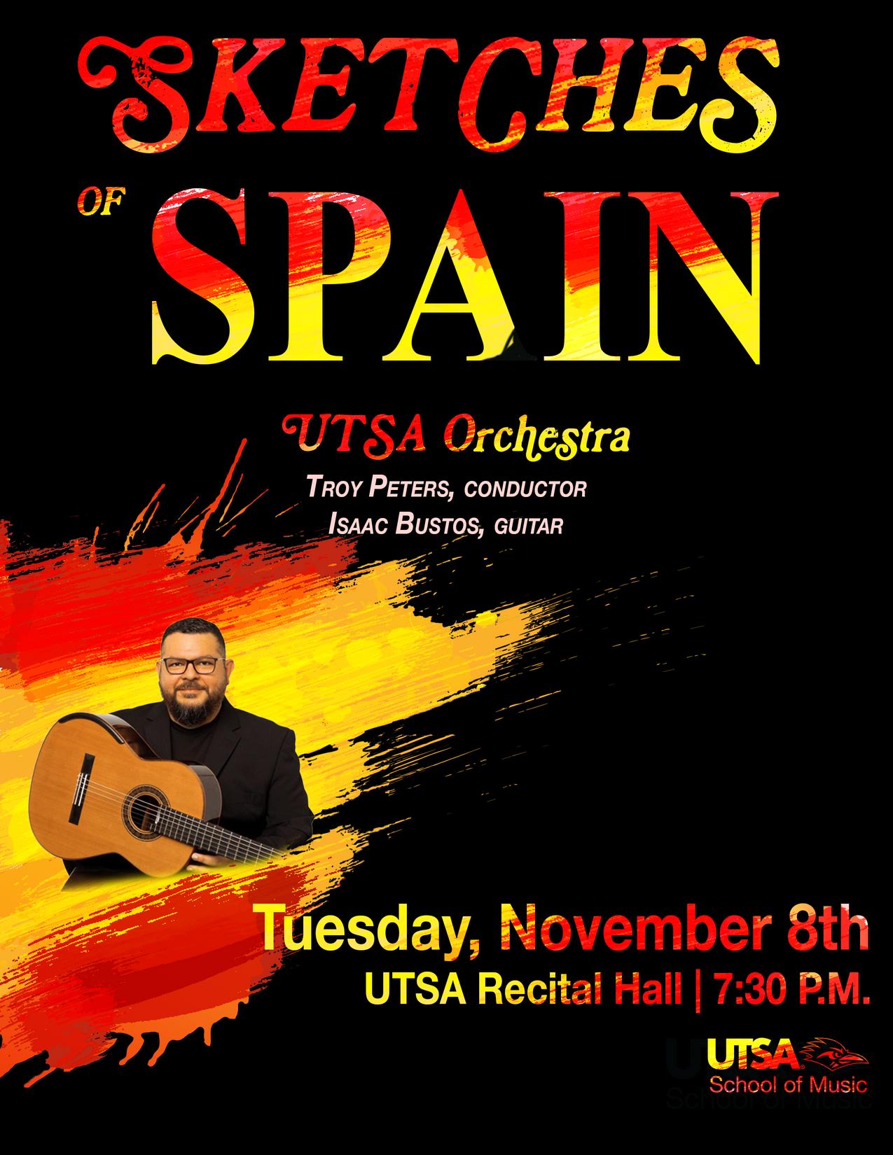 On November 8th, 2022, the UTSA Orchestra will perform its second concert of the Fall 2022 semester, Sketches of Spain, featuring Dr. Isaac Bustos on guitar. Th e concert is an excellent opportunity to hear some of the most renowned works of Spanish classical music. Led by conductor Troy Peters, the flagship ensemble is geared up and ready to deliver a night that’s sure to be remembered.