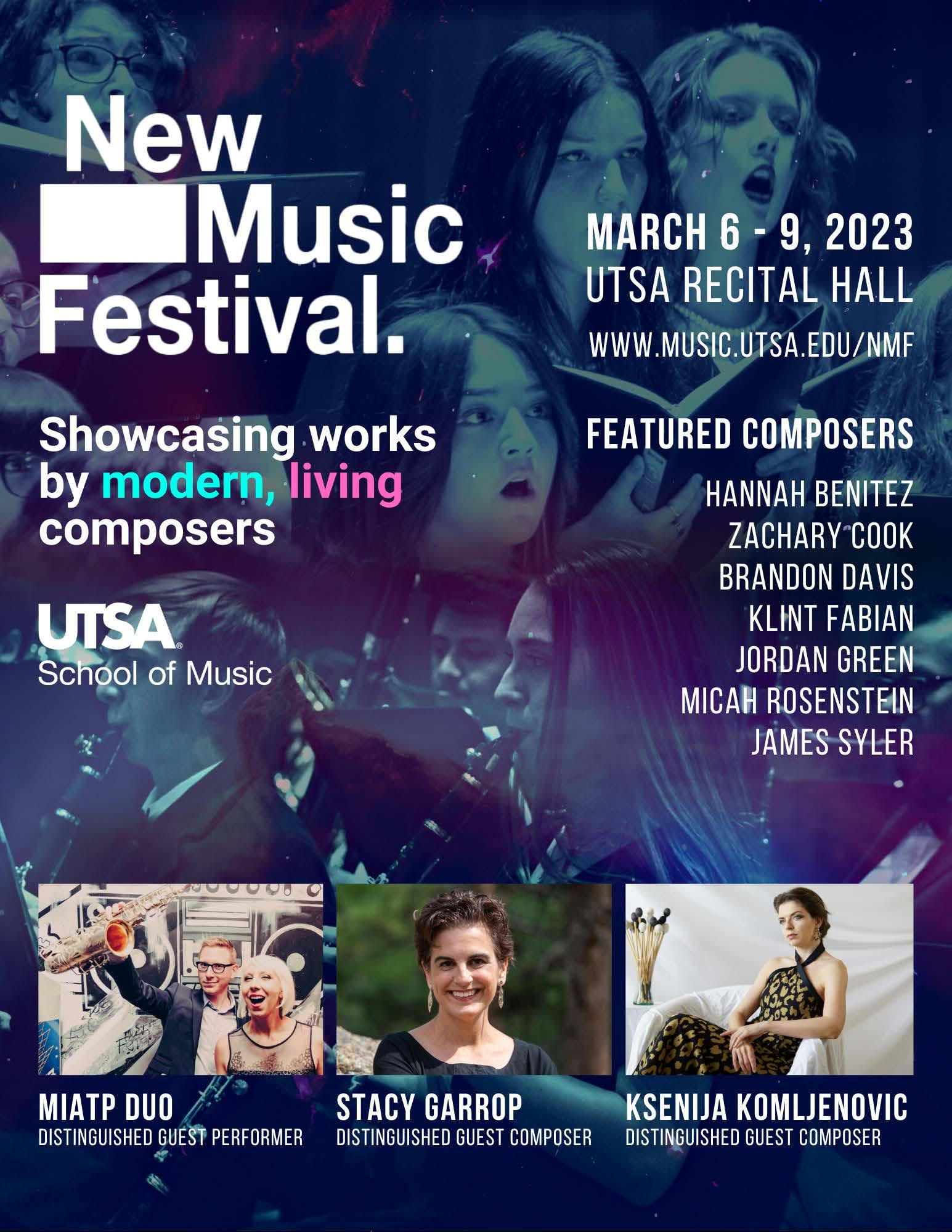 What better way to kick off March at the UTSA School of Music than with a week-long, exciting event filled with innovative music, composition and brilliance? The 2023 New Music Festival will be held at the UTSA Recital Hall from Monday, March 6th to Thursday, March 9th. The festival will feature a variety of talents and sounds, reflecting new and progressing concepts not only in the music realm but also in the realm of our everyday lives.