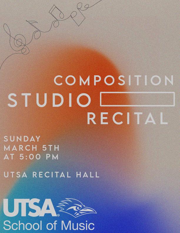 M A Y 6 , 2 0 2 3 F I N A L A U D I T I O N D A T E E CULTIVATE ARTIST W E CREATE BOLD FUTURES music.utsa.edu @utsamusic ApplyMusic@utsa.edu W E ARE THE UNIVERSITY OF TEXAS AT SAN ANTONIO W