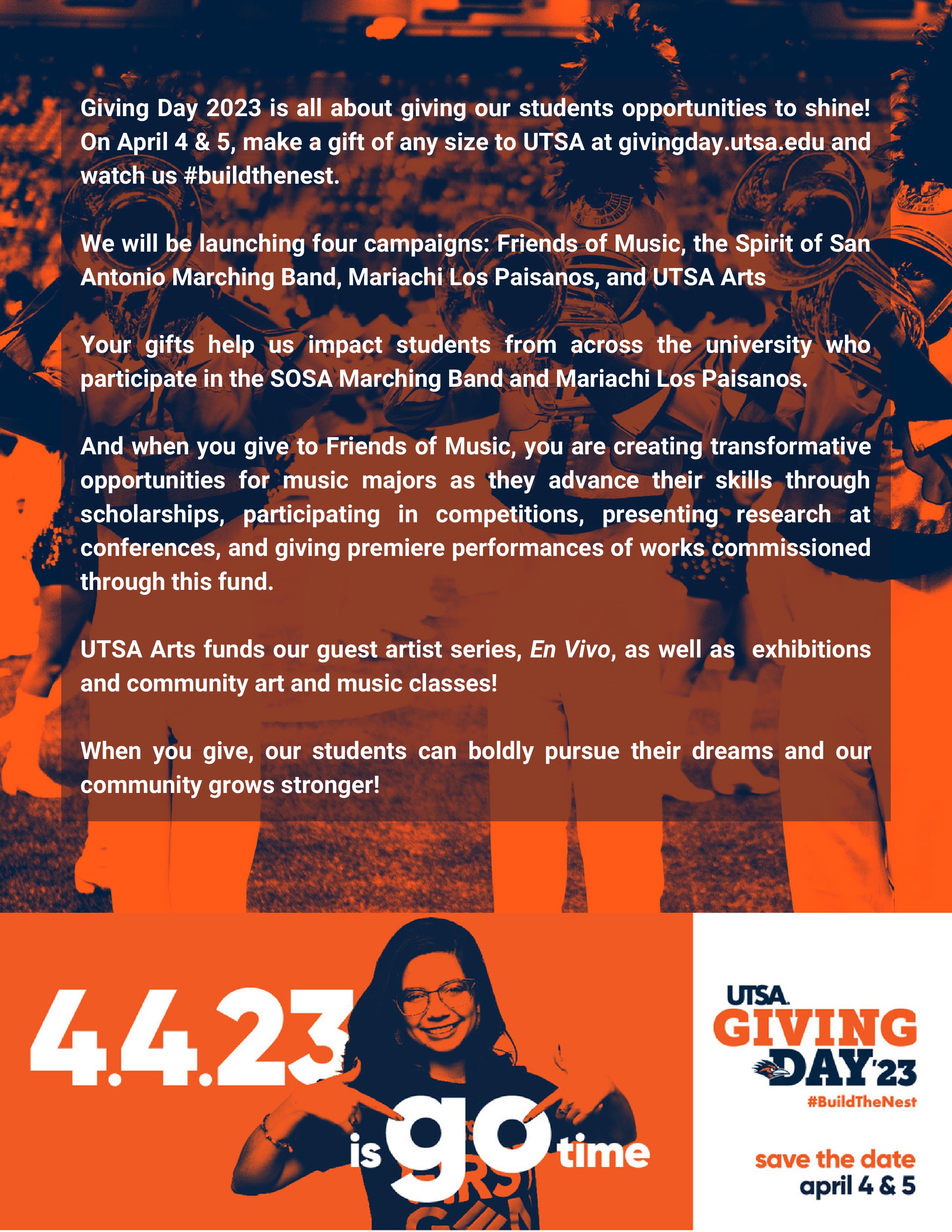 This issue is packed with feature articles that provide a glimpse into life in the School of Music and out in the community through our Alumni Spotlight, Happening Around the Nest, and Tier-One Faculty features. We welcome your submissions, as well – we know our alumni are doing amazing work in a wide range of fields, and we’d love to hear from you! We also invite you to save the date for UTSA Giving Day on April 4-5, 2023 – this is a fun way for you to help us #BuildtheNest and support so many important initiatives in the School of Music!