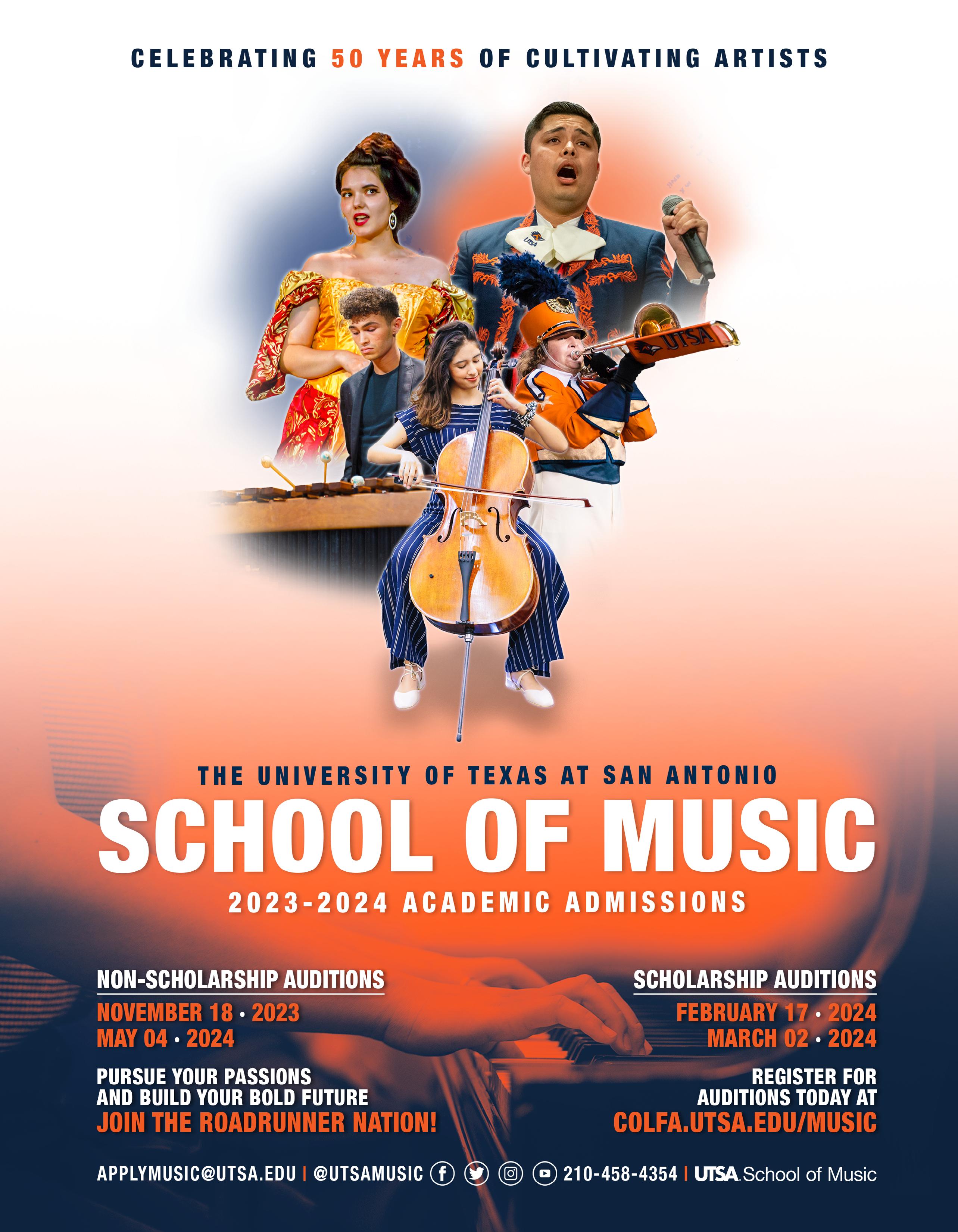 We are inspired to begin a new academic year leading into the celebration of the 50th anniversary of the School of Music in all its forms at UTSA, and we are grateful for all of you who support our work to learn and share music with those around us. As we begin this new concert season, we look forward to warmly welcoming you to celebrate with us all that the arts bring to our lives!
