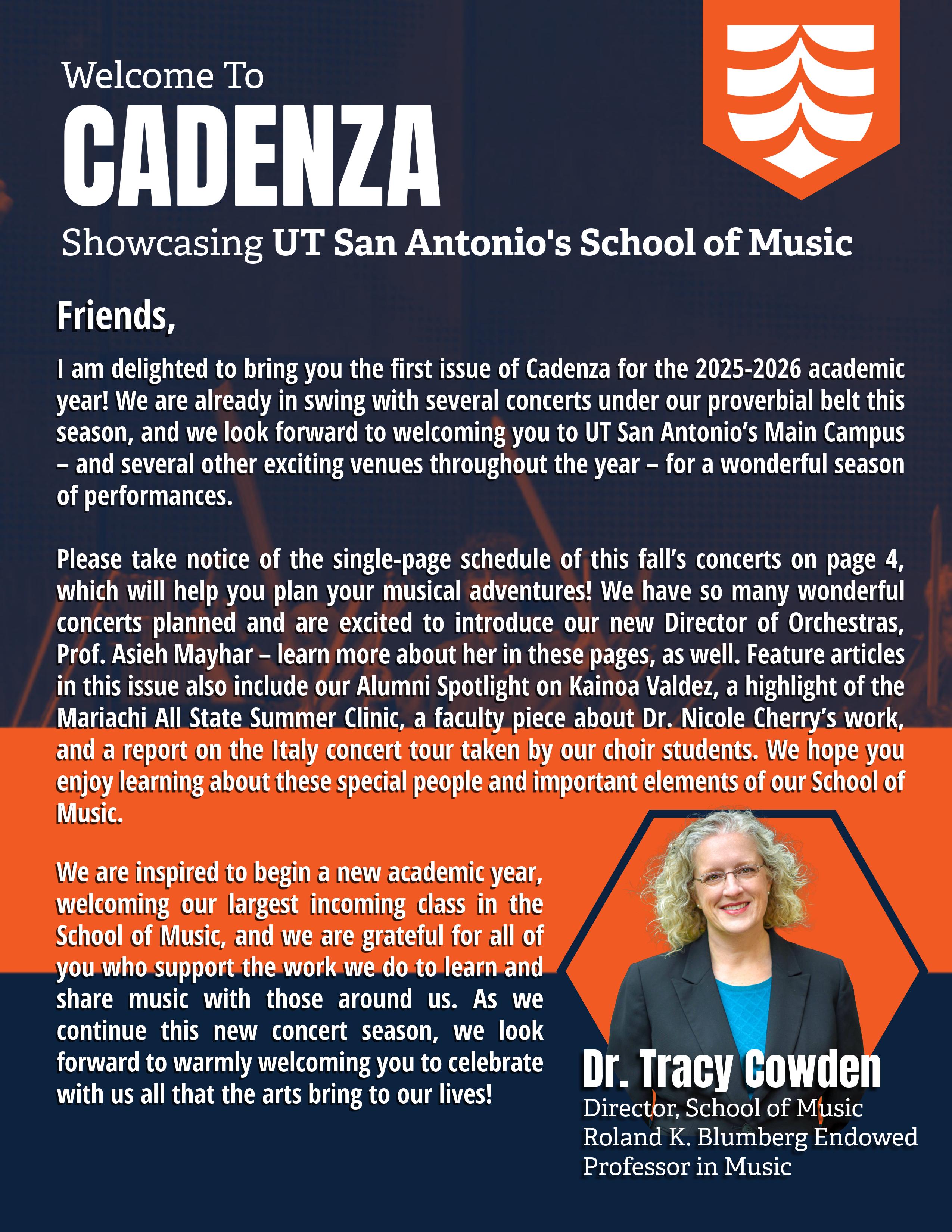 For the professor, she was drawn to the warmth and ambition of the music community here at UTSA, including the colleagues she would gain, including emeritus professor Dr. Gene Dowdy, who had already laid a student-centered, collaborative foundation in the string area of the program. She reflects on her entrance into the program and goes on to note her day-to-day lifestyle as an instructor.