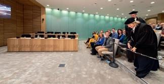 ‘Zeergeleerde doctor [….….] Mag ik u ook namens de universiteit feliciteren met de behaalde waardigheid. U hebt vanaf nu het recht de doctorstitel te dragen. Uw doctorstitel betekent dat de samenleving op de kwaliteit van uw oordeel kan vertrouwen, dat u integer en transparant handelt en dat u onafhankelijk communiceert over de resultaten en de maatschappelijke relevantie van uw werk. Waardeer de doctorstitel als een eervolle onderscheiding en een welverdiend voorrecht, maar vergeet daarbij nooit de plicht die zij u oplegt, jegens wetenschap en de samenleving. Ik heb gezegd.’