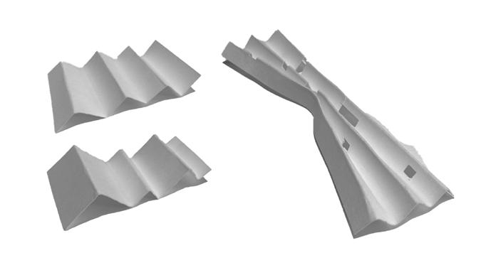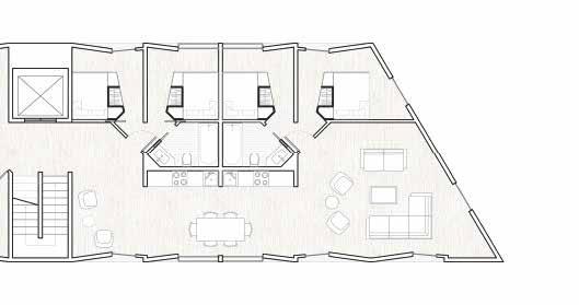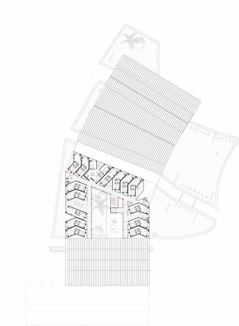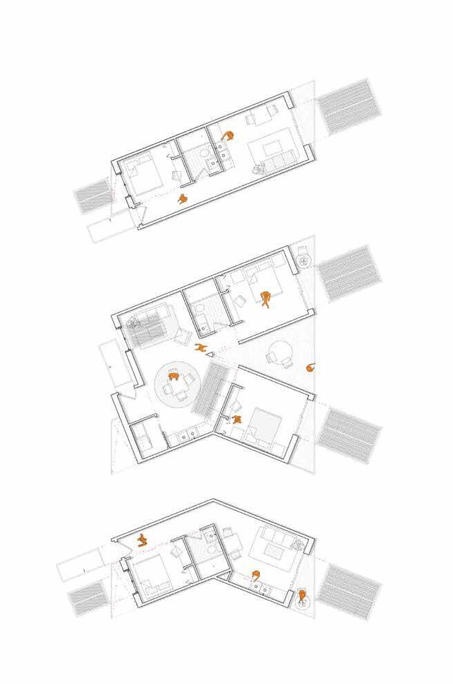 Housing units rise up from above the profile of the roof structure into a private realm above the street level, offering residents a dignified and peaceful living space. The units themselves also derive their design from the profile of the Drassanes roofline. There are three different unit types, two one-bedroom designs, and one two-bedroom design, and their irregular plan layouts allow for dynamic unit aggregation and the creation of an expressive facade. Voids form between the edges of some units which residents can occupy and congregate in.Together, these elements produce a cohesive architectural system that stitches together public and private realms while honoring the site’s historic context..