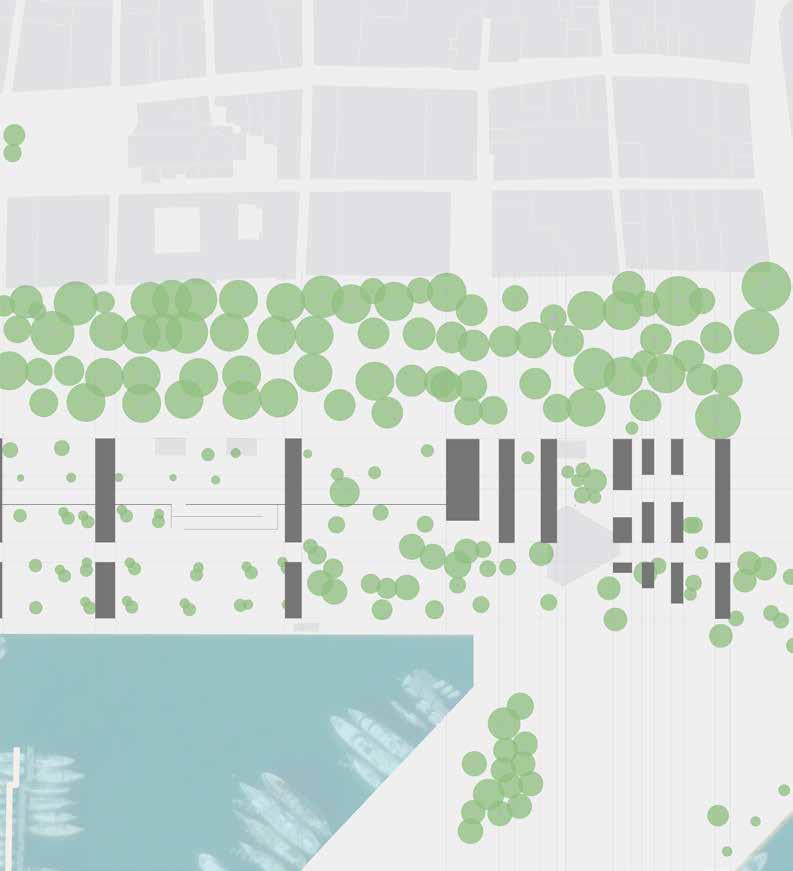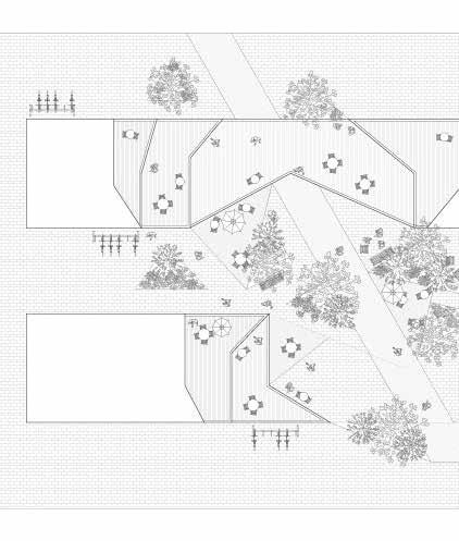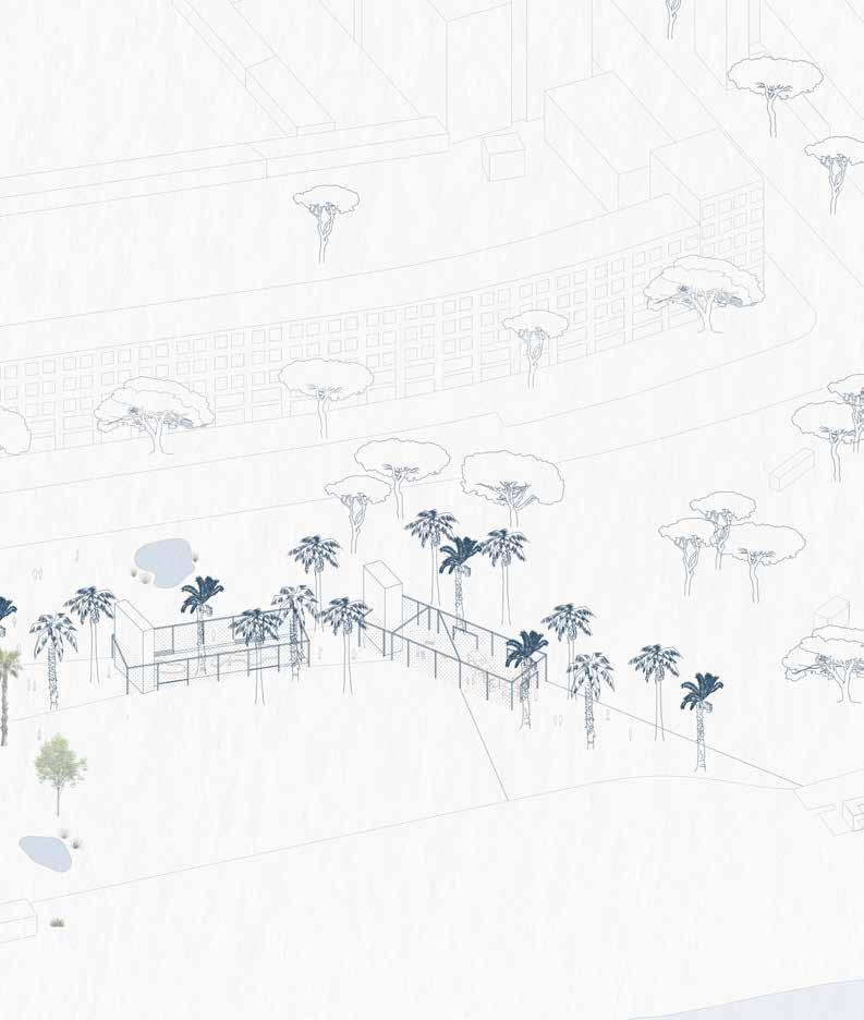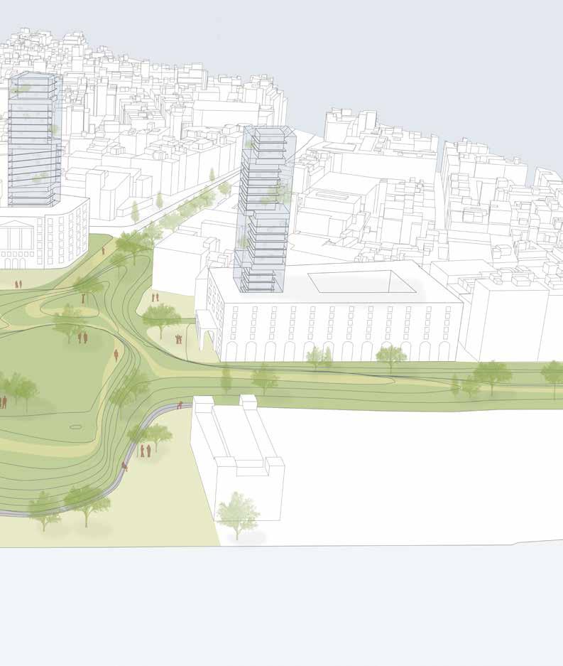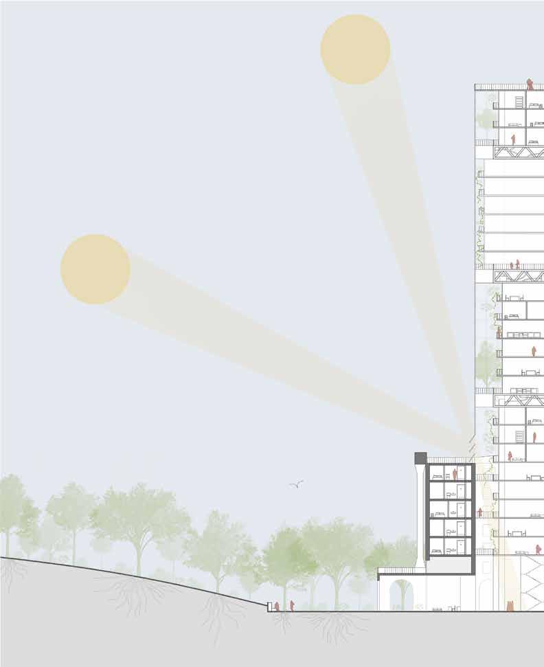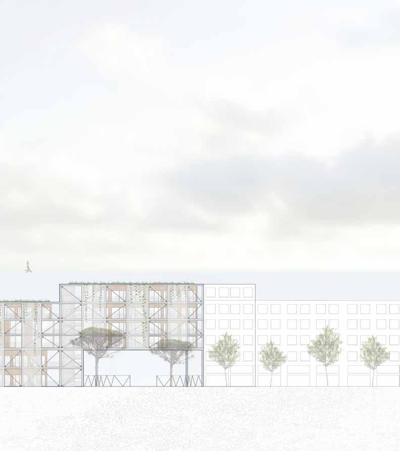 The project repairs this fracture through an integrated approach combining ecological interventions and mixed-use residential development. The housing consists of studio apartments for young adults, organized in rectangular bars that respond to both the existing urban fabric and Barceloneta’s iconic linear typology. As these bars extend beyond the site, they splinter into pavilions on the adjacent plaza, connected to the main housing through a public bridge.