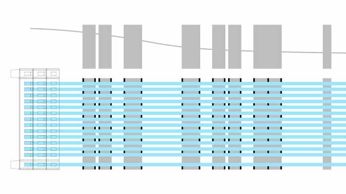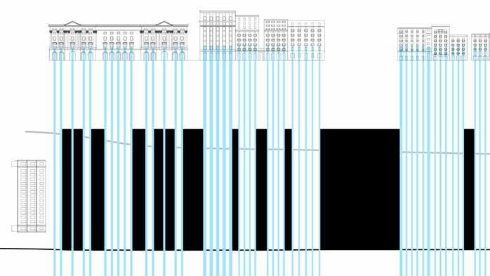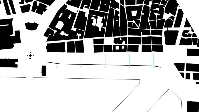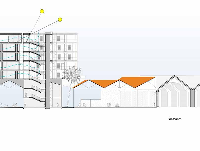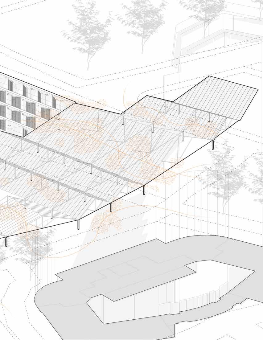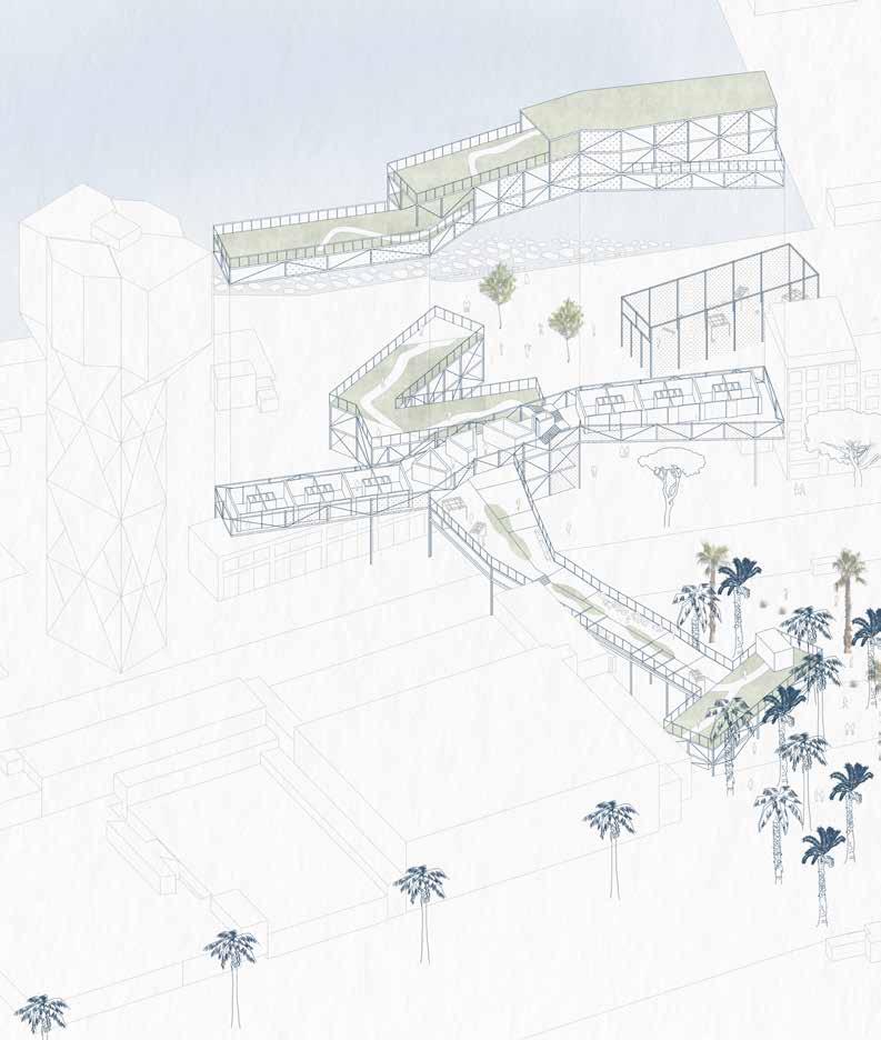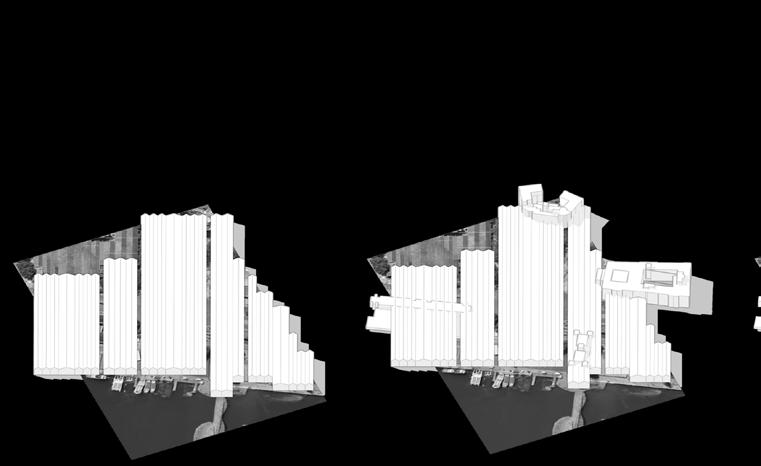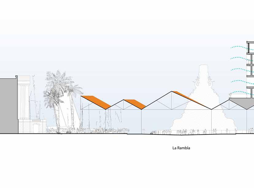 Connective Rhytmns devises a system for housing and public space derived from the formal language of the neighboring Drassanes Royal Shipyards. The project deploys an undulating roof structure across the coastal end of La Rambla—a major pedestrian artery through the heart of Barcelona—providing a shaded moment of pause at the end of the avenue.