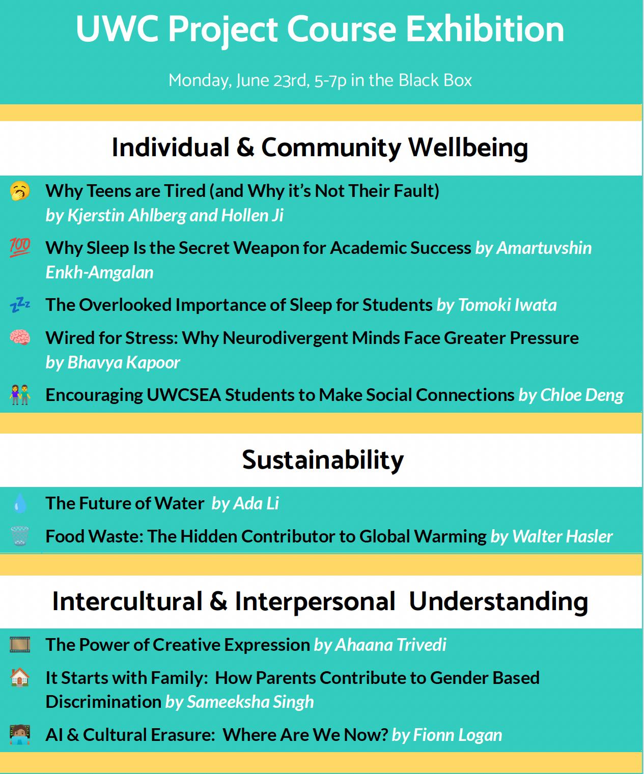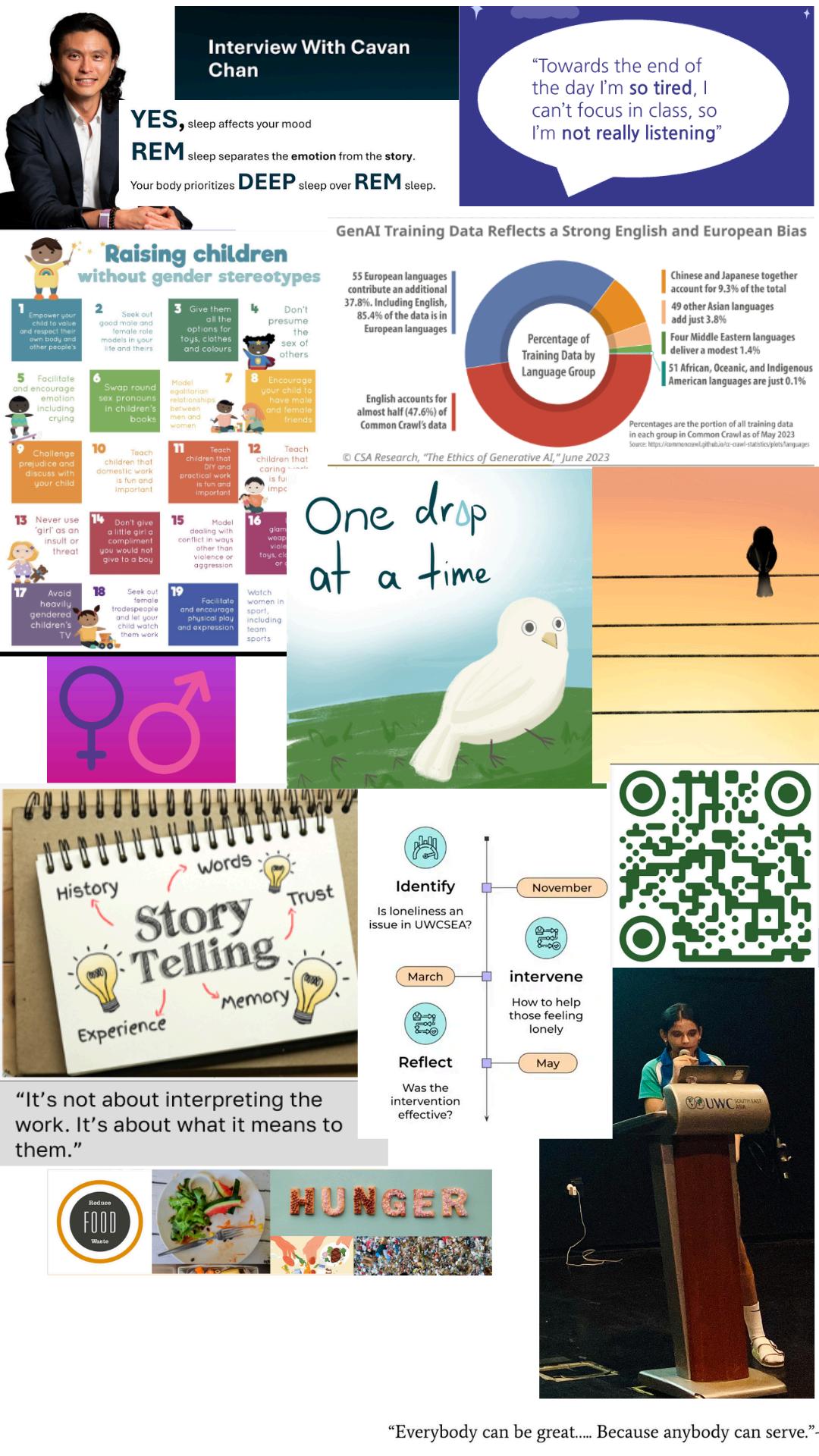 In their action plans, students are tackling a range of issues such as food waste, water shortages, AI’sroleinculturalerasure,lonelinessinhighschool, sleepdeprivation,phonehygiene,supportforneurodiverselearners,andgenderedparenting-justtonamea few OnJune23rd,studentswillsharetheirlearningjourneywiththeirparentsandpeers,celebratingtheir