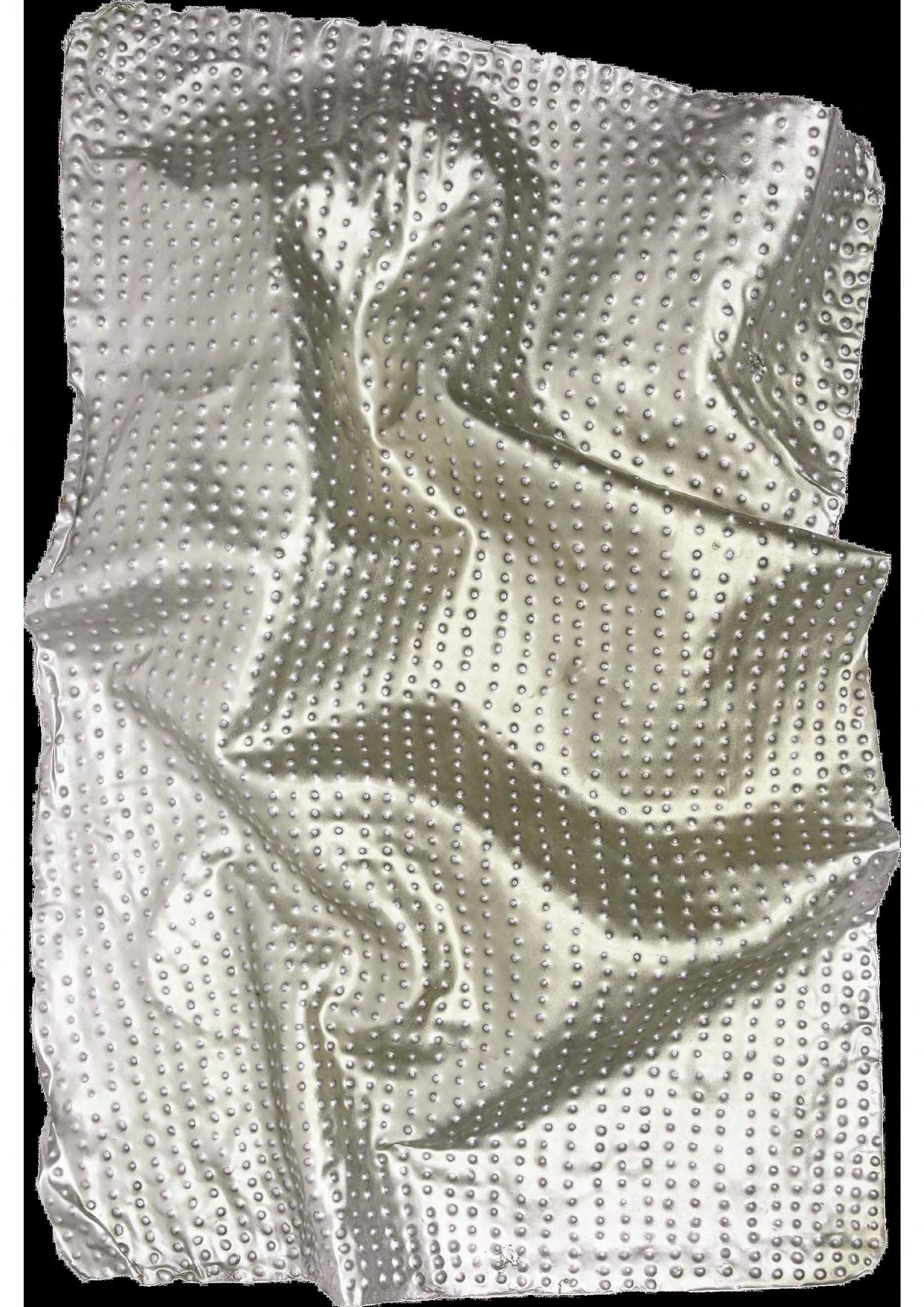 Sample 7 screen print and dyed stripe silk with pink cotton layer hand stitched with polyester thread and free brushed devoure paste effect. Gold bead detail and handmade copper domes.