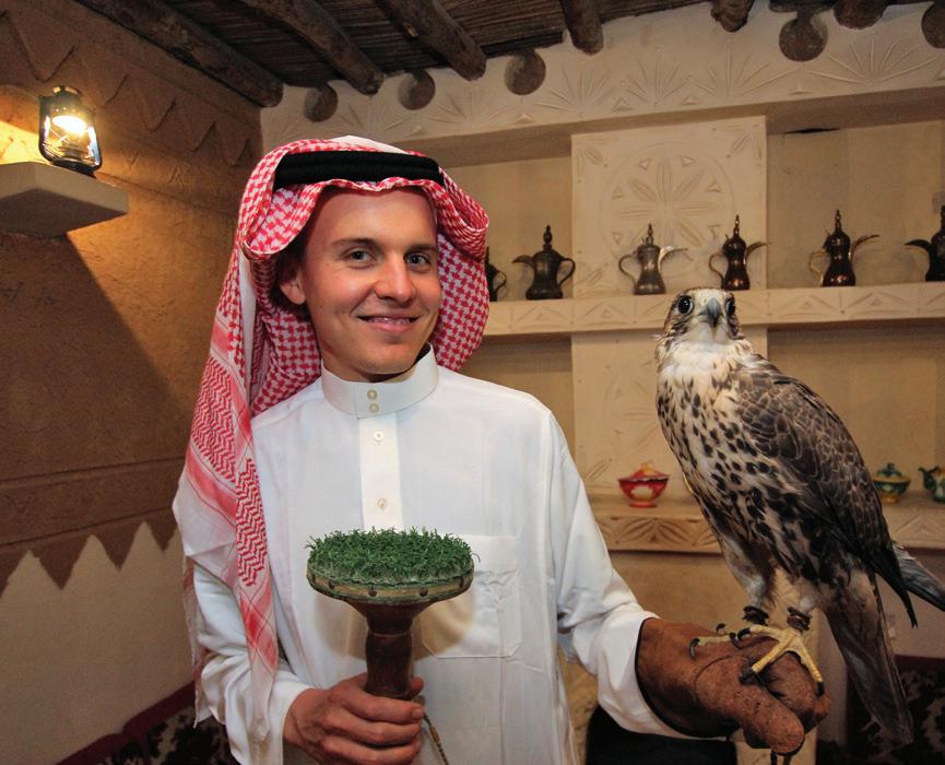 Right: The veterinarian holds a falcon while stationed in Saudi Arabia.